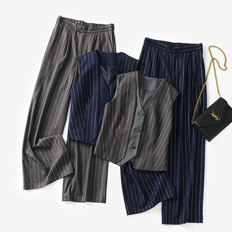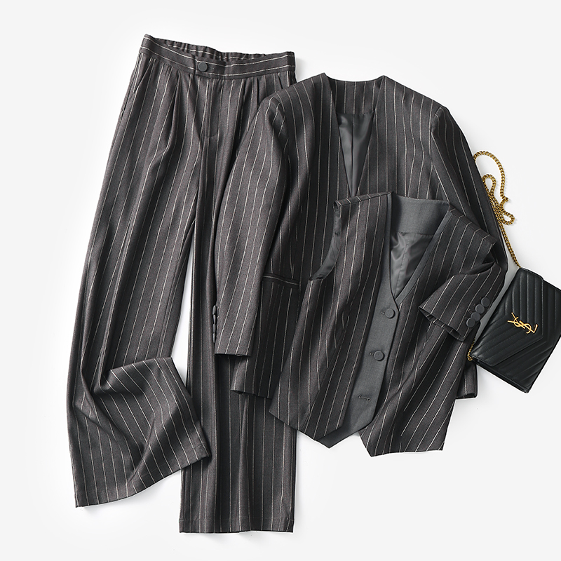 淘么淘 法式腔调复古老钱风假两件条纹V领马甲+西装+直筒裤三件套