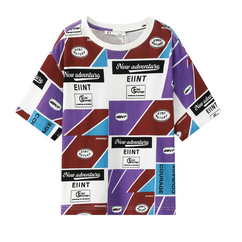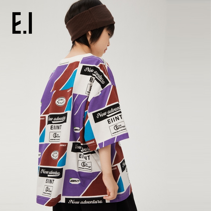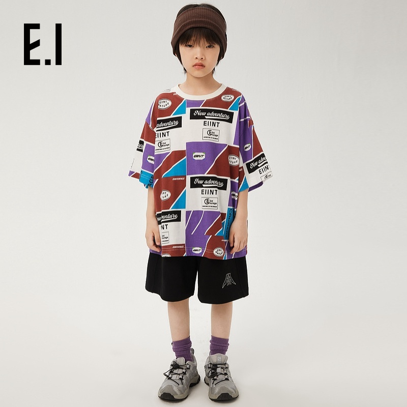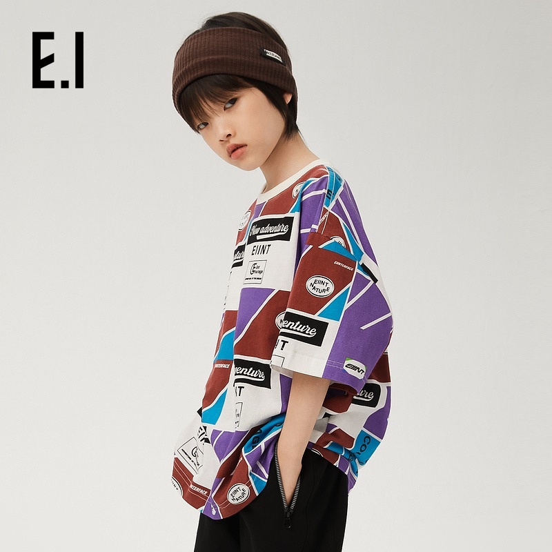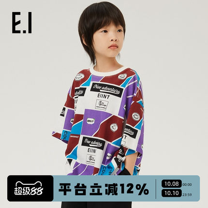ei童装男童短袖T恤夏装新款中大童复古港风满印宽松休闲上衣