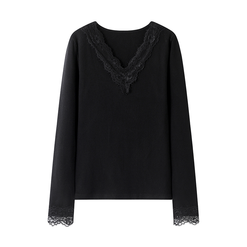 【春春Spring】纯色蕾丝拼接长袖T恤时尚百搭V领修身显瘦打底衫