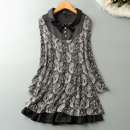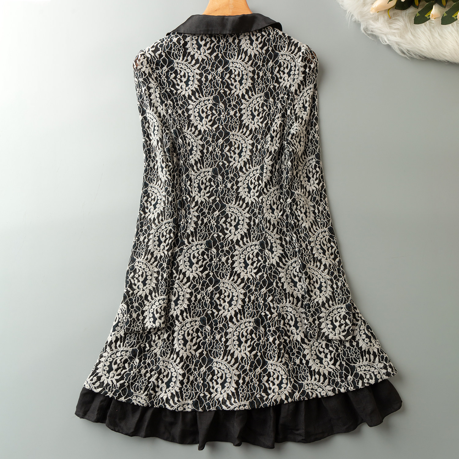 春秋外贸韩版新款 简约百搭 蕾丝拼接 翻领长袖套头连衣裙