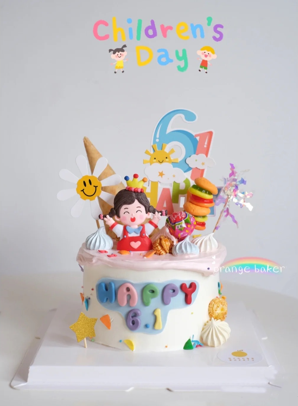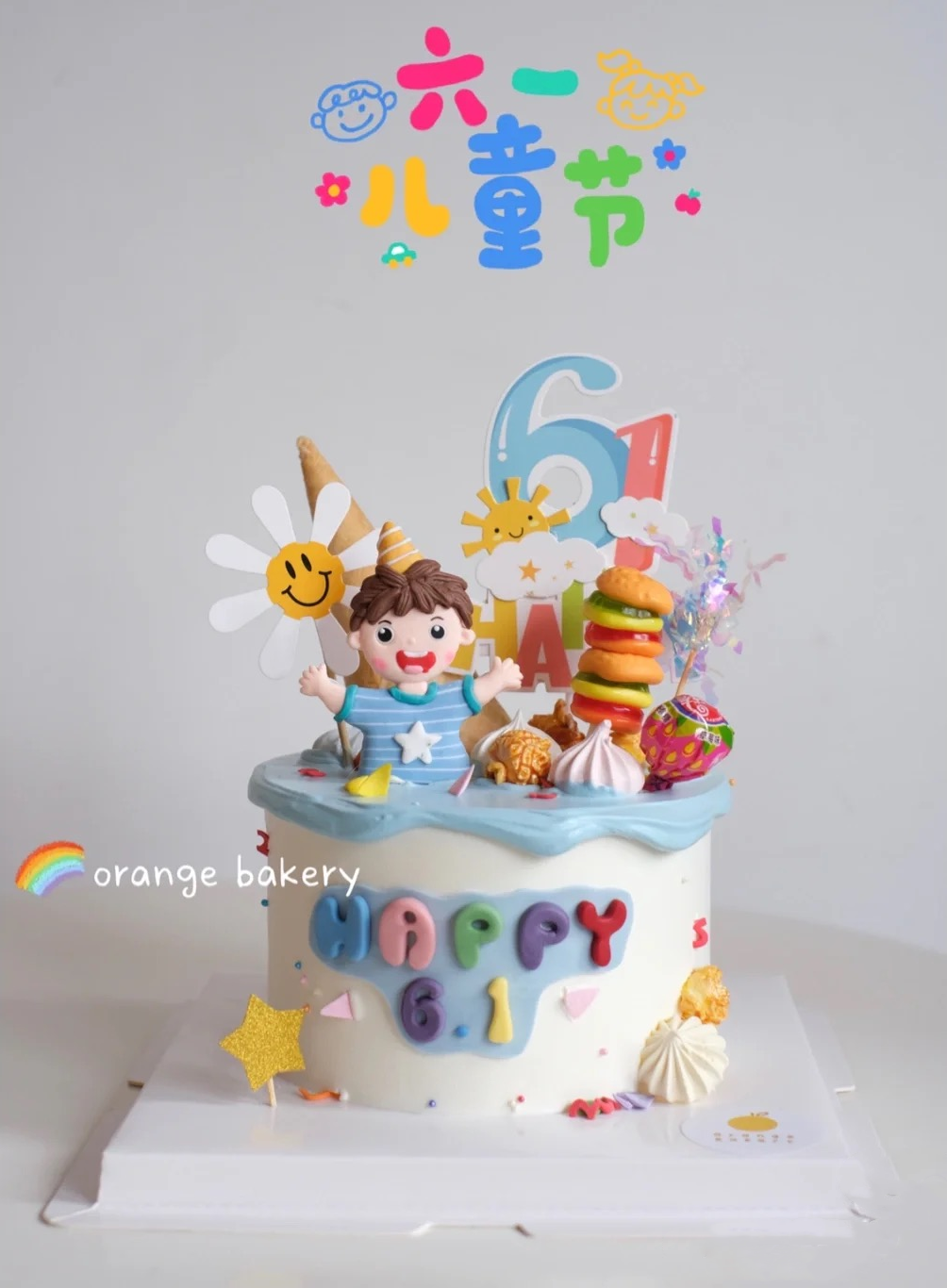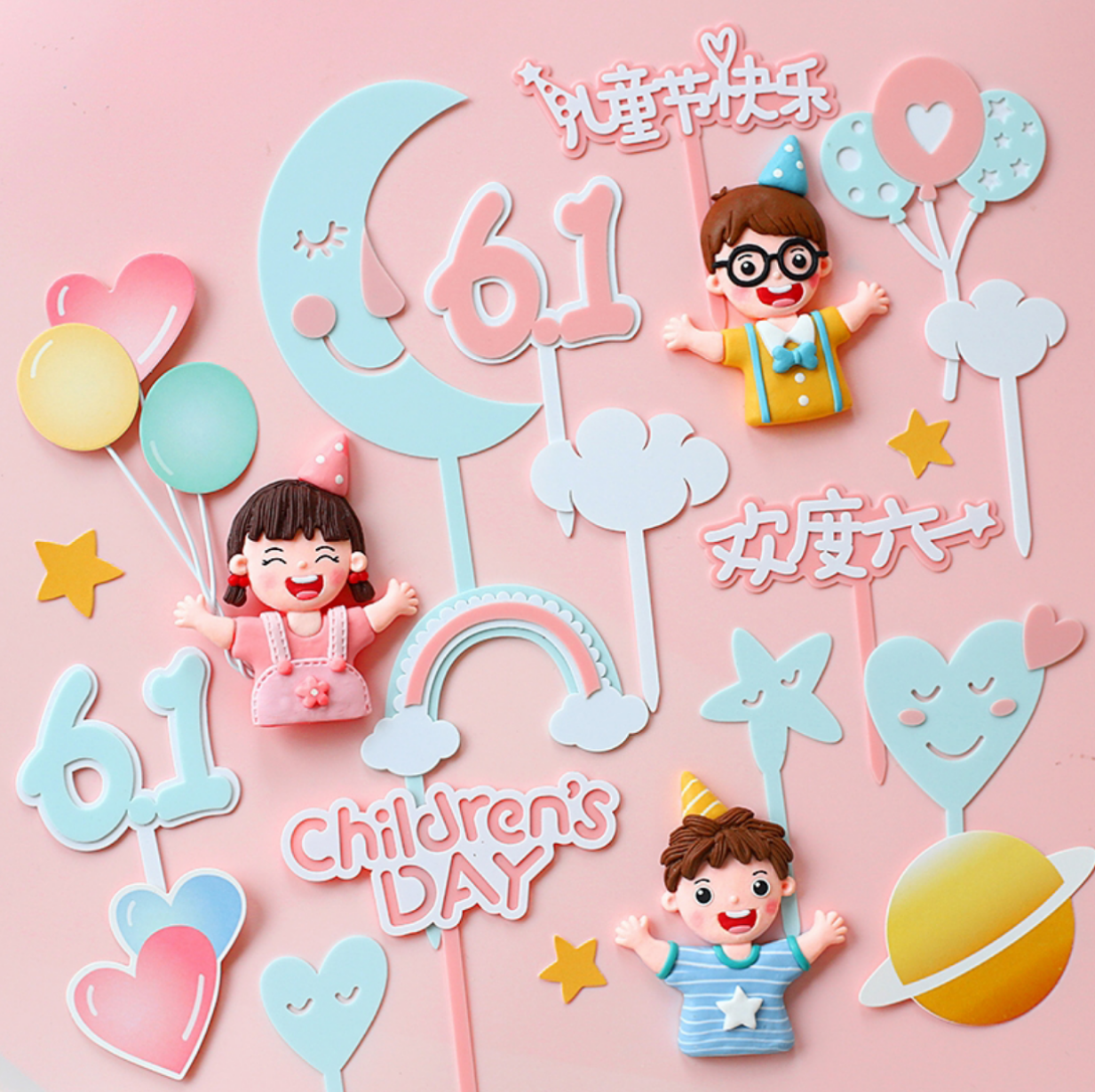 六一儿童节蛋糕装饰摆件大头男孩女孩软陶插件黄帽子小朋友插牌