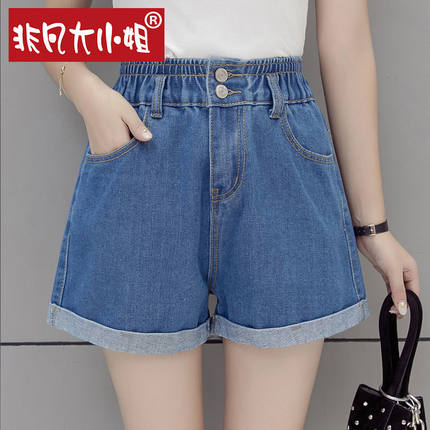 60棉松紧腰高腰牛仔短裤女夏宽松胖mm卷边大码热裤