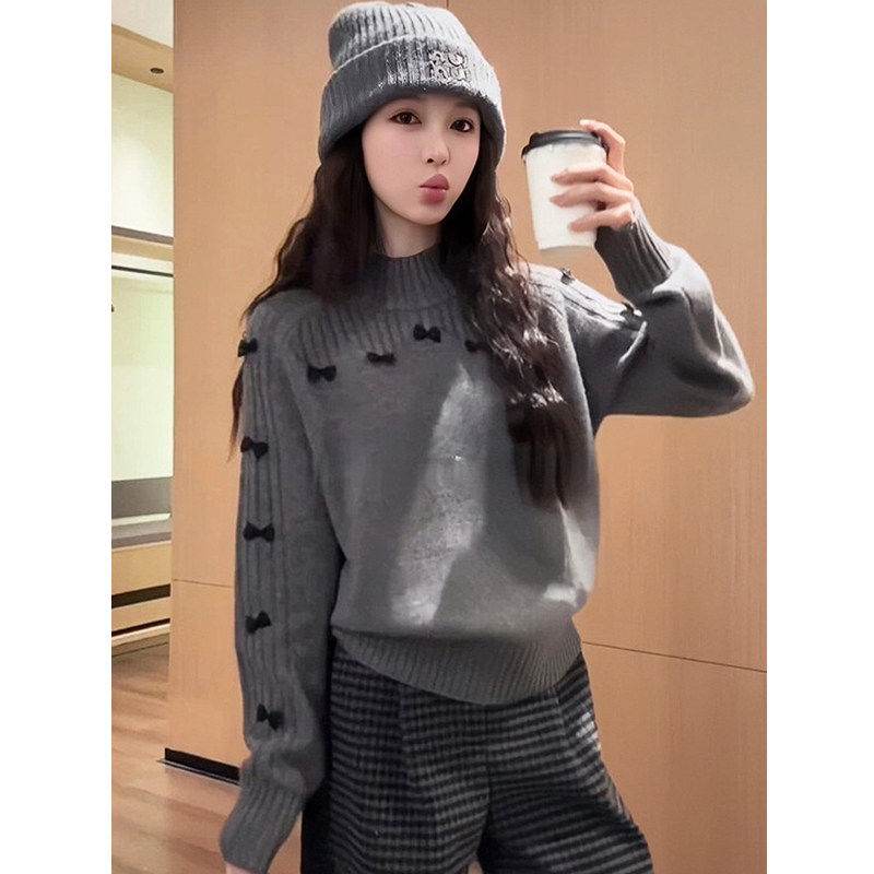 蝴蝶结灰色高领毛衣女2025冬季新款松弛风显瘦减龄格子阔腿裤套装