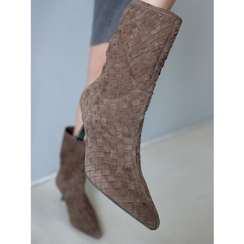 KAKA 法式名媛尖头羊皮反绒编织中筒靴四季短靴细高跟短靴时装靴