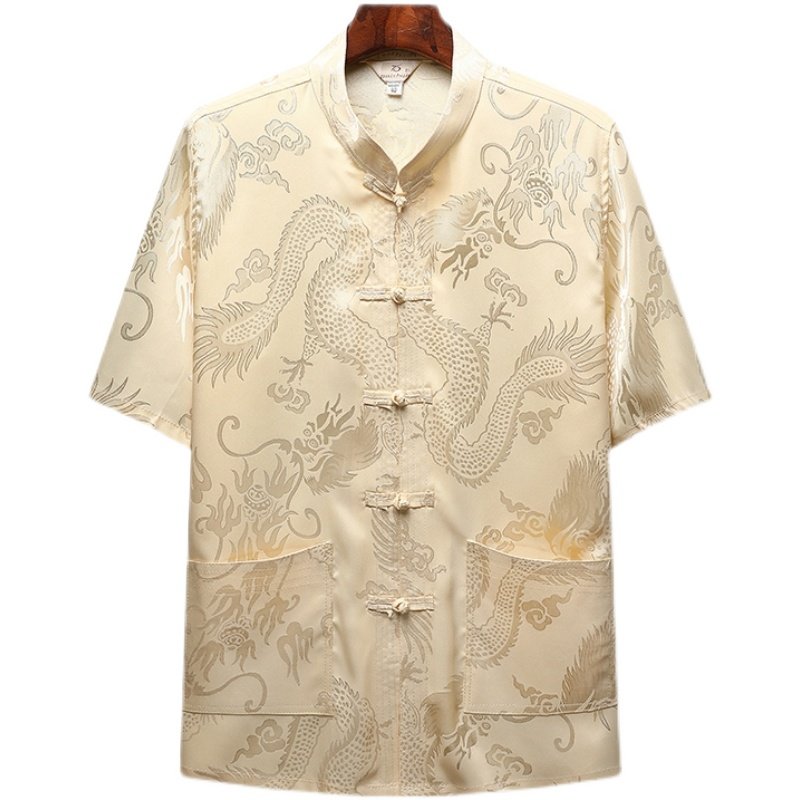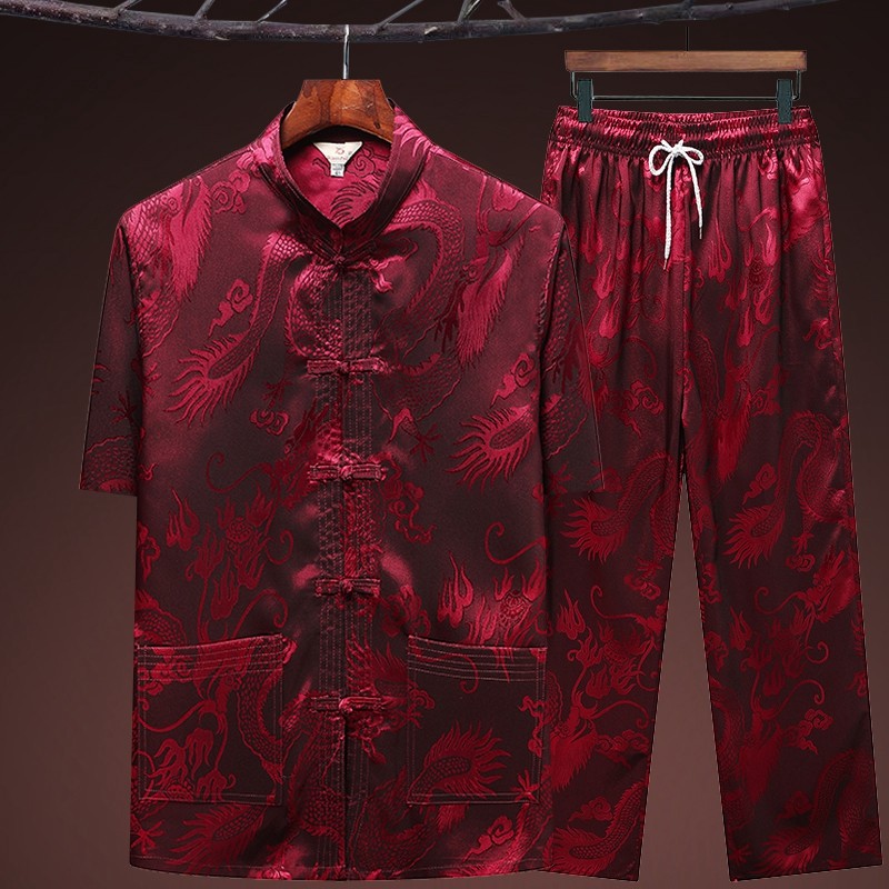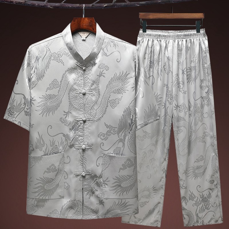 夏季冰丝中老年人唐装男短袖两件套装爸爸装丝质衬衫爷爷晨练汉服