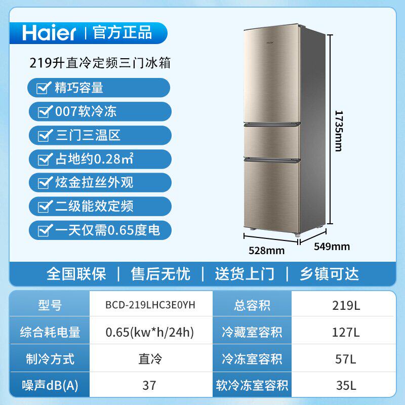 海尔冰箱219L三门家用节能小型电冰箱大容量出租房宿舍直冷小冰箱