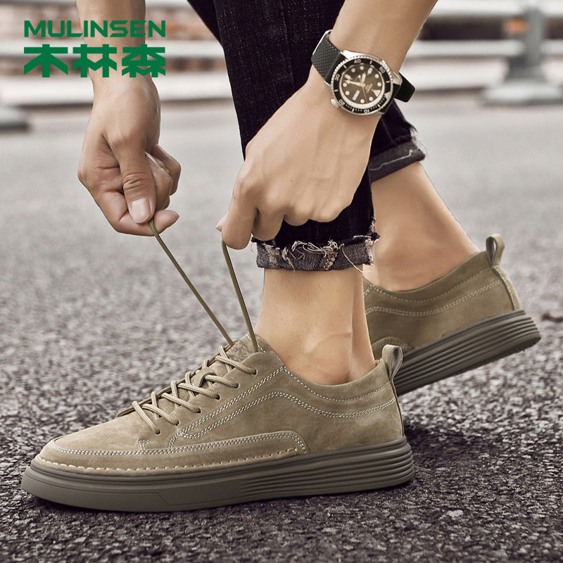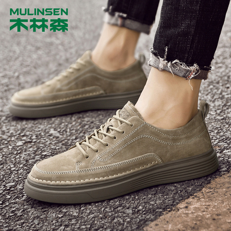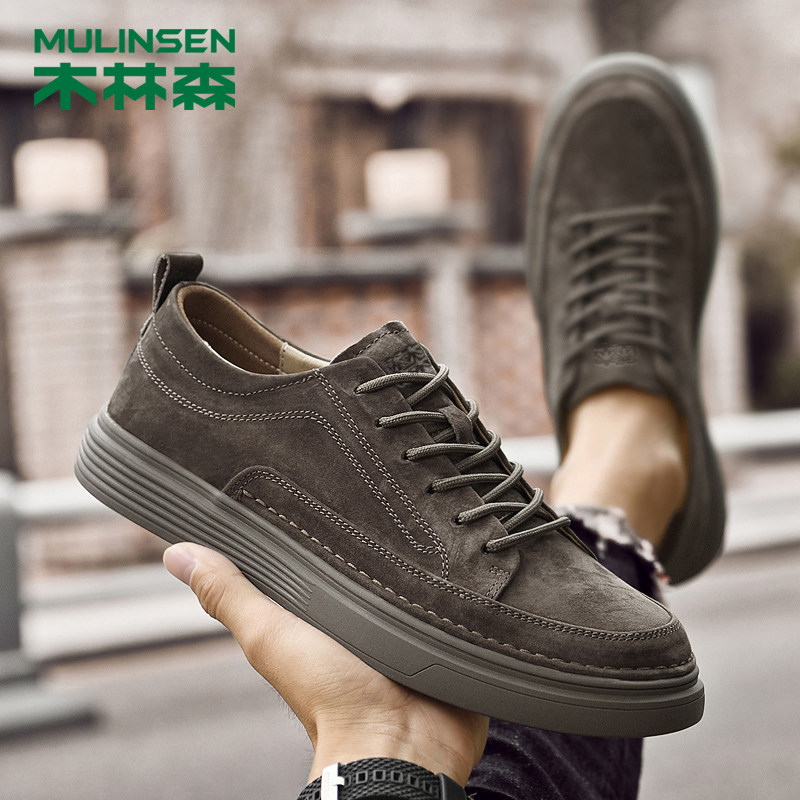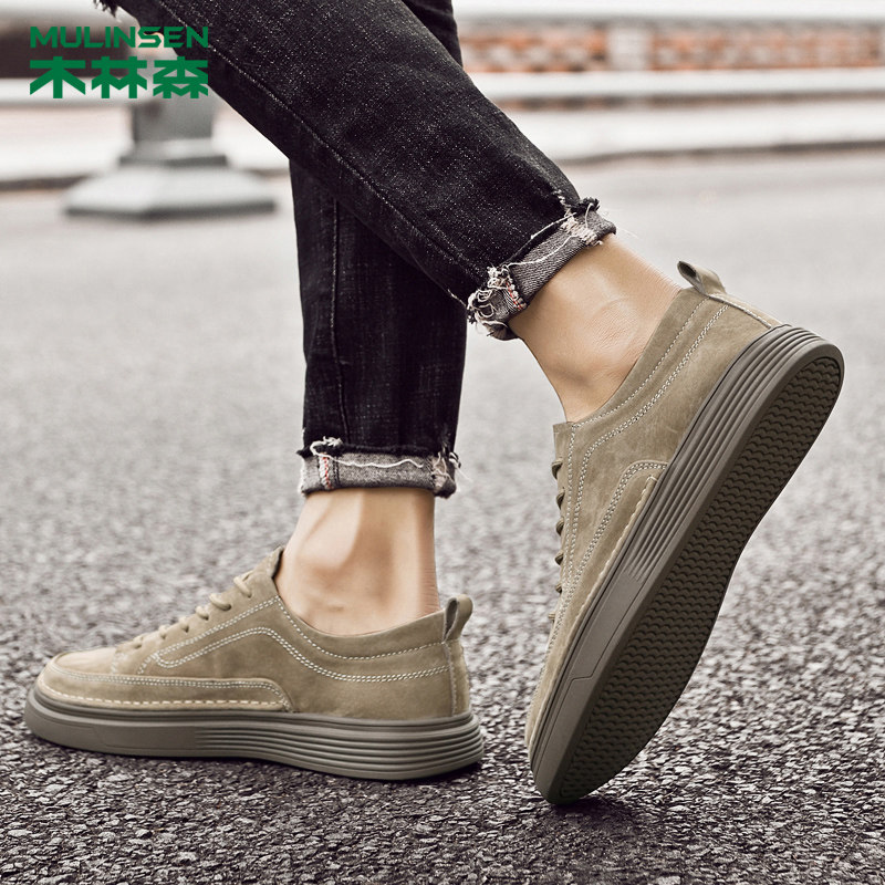 木林森男鞋休闲皮鞋男真皮系带平跟软底耐磨百搭复古运动板鞋软面