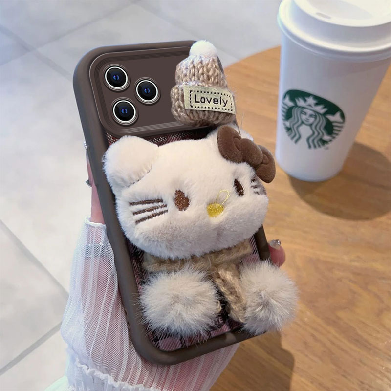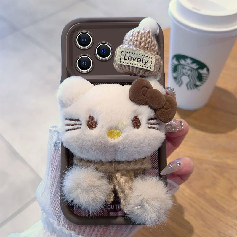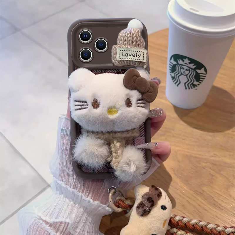 毛绒KT猫适用苹果17手机壳iPhone16Promax新款15软IP14可爱带挂绳5硅胶13软秋冬12女11好看8plus防摔6保护套