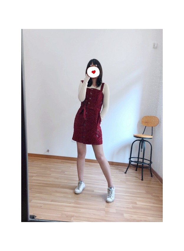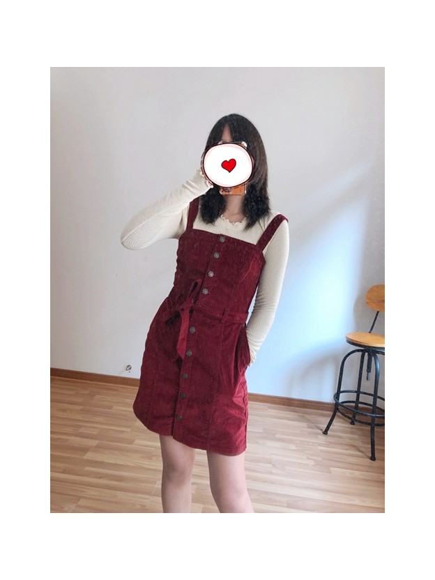 纯甄!安可拉红!复古质感灯芯绒~法式少女~前排纽扣腰带背带裙
