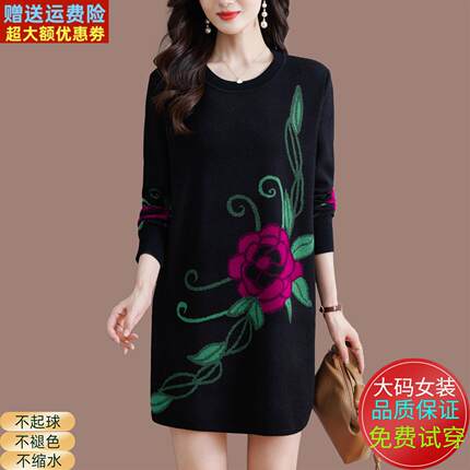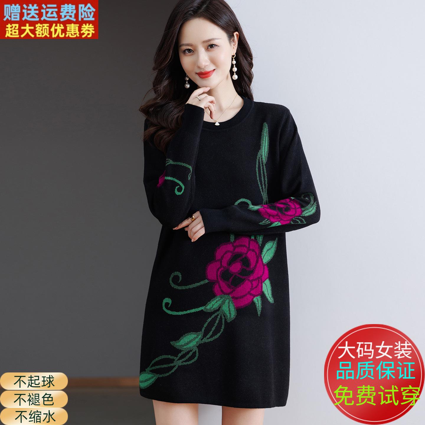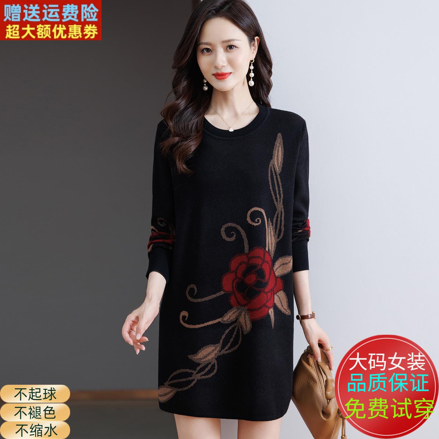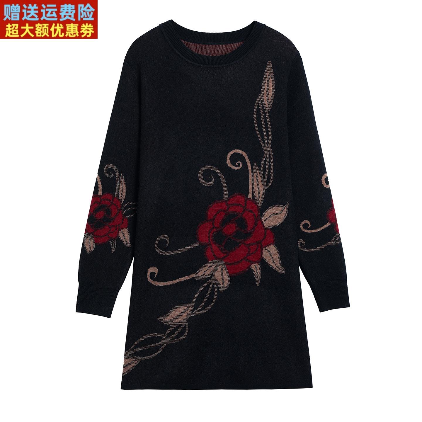 中年妈妈印花针织打底衫女秋冬圆领羊绒衫洋气大码宽松中长款毛衣