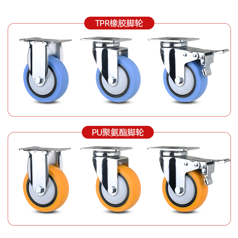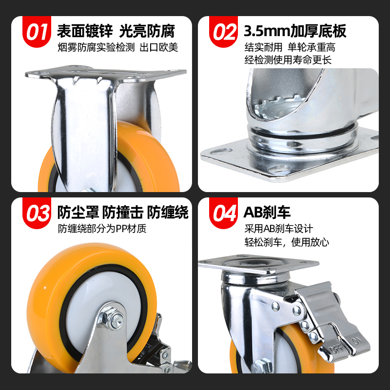 3寸45万向轮轮子重型静音小推车拖车橡胶聚氨酯脚轮带AB刹车轱辘