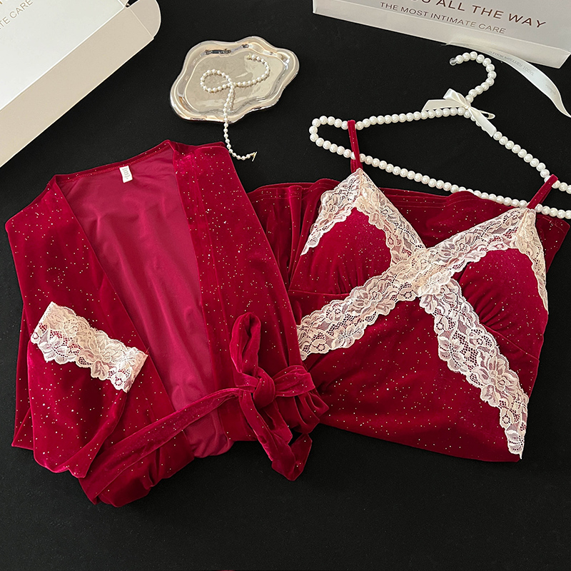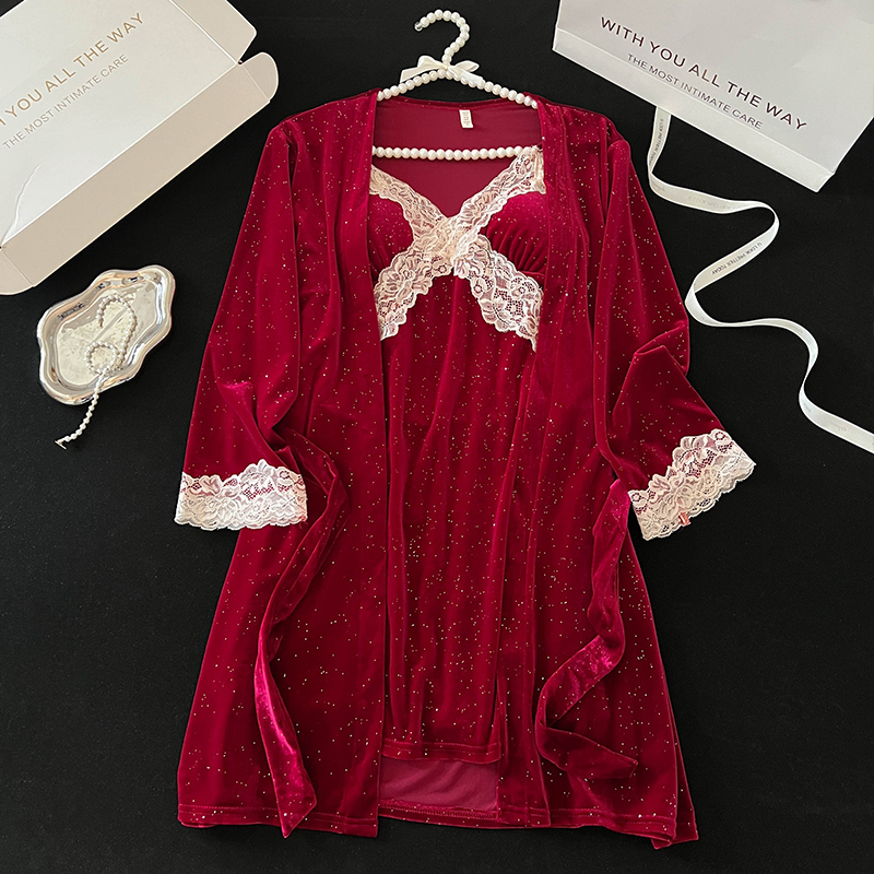 金丝绒睡衣女冬季加绒保暖性感吊带睡裙睡袍带胸垫新婚红色家居服