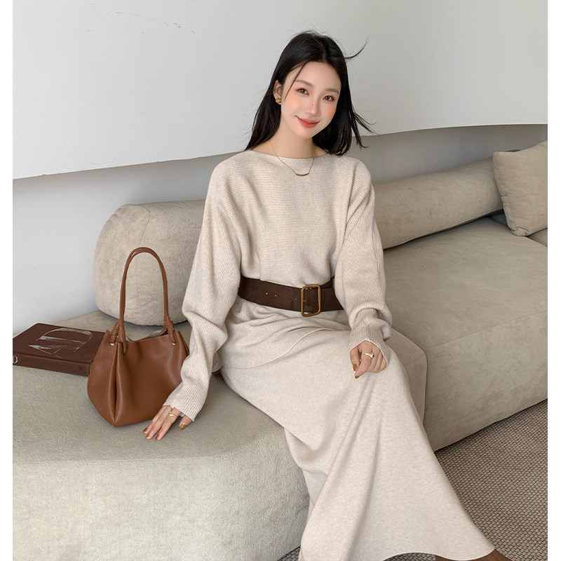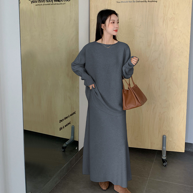 韩版圆领针织宽松套头毛衣高级斜肩两件套半身长裙套装