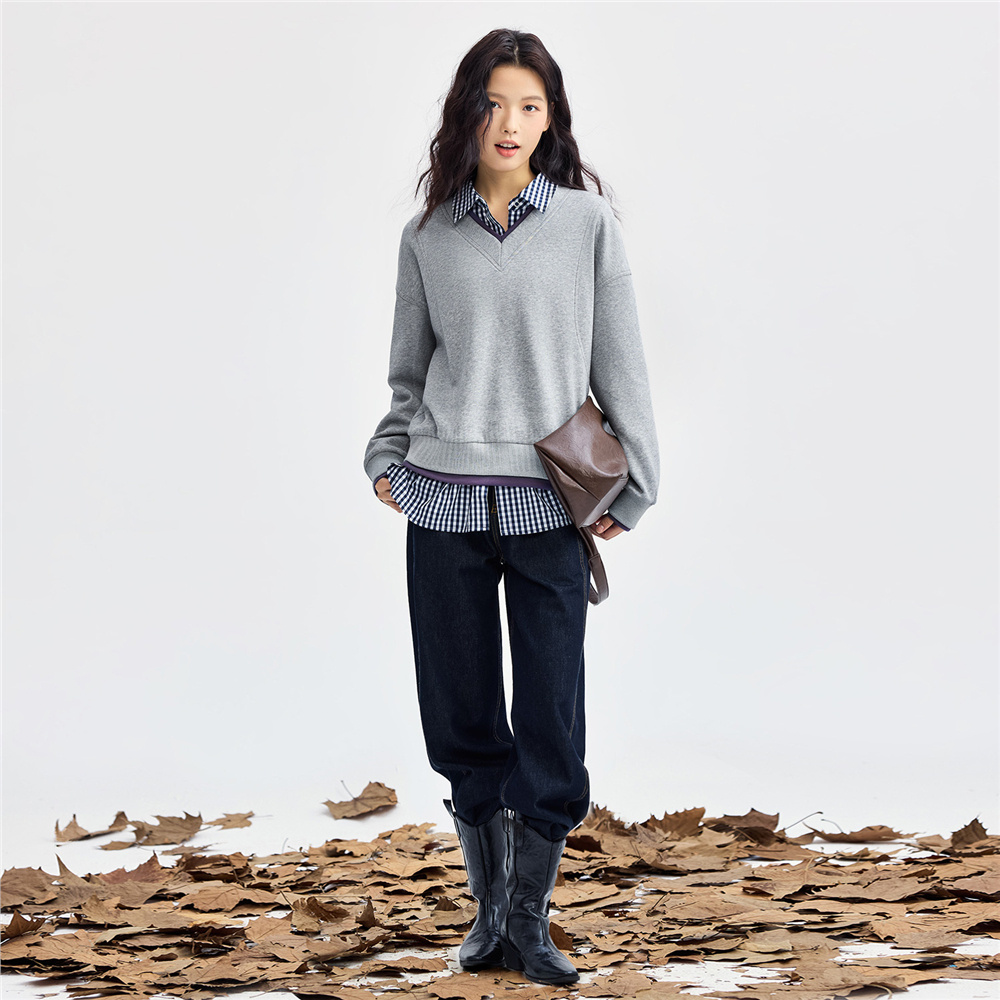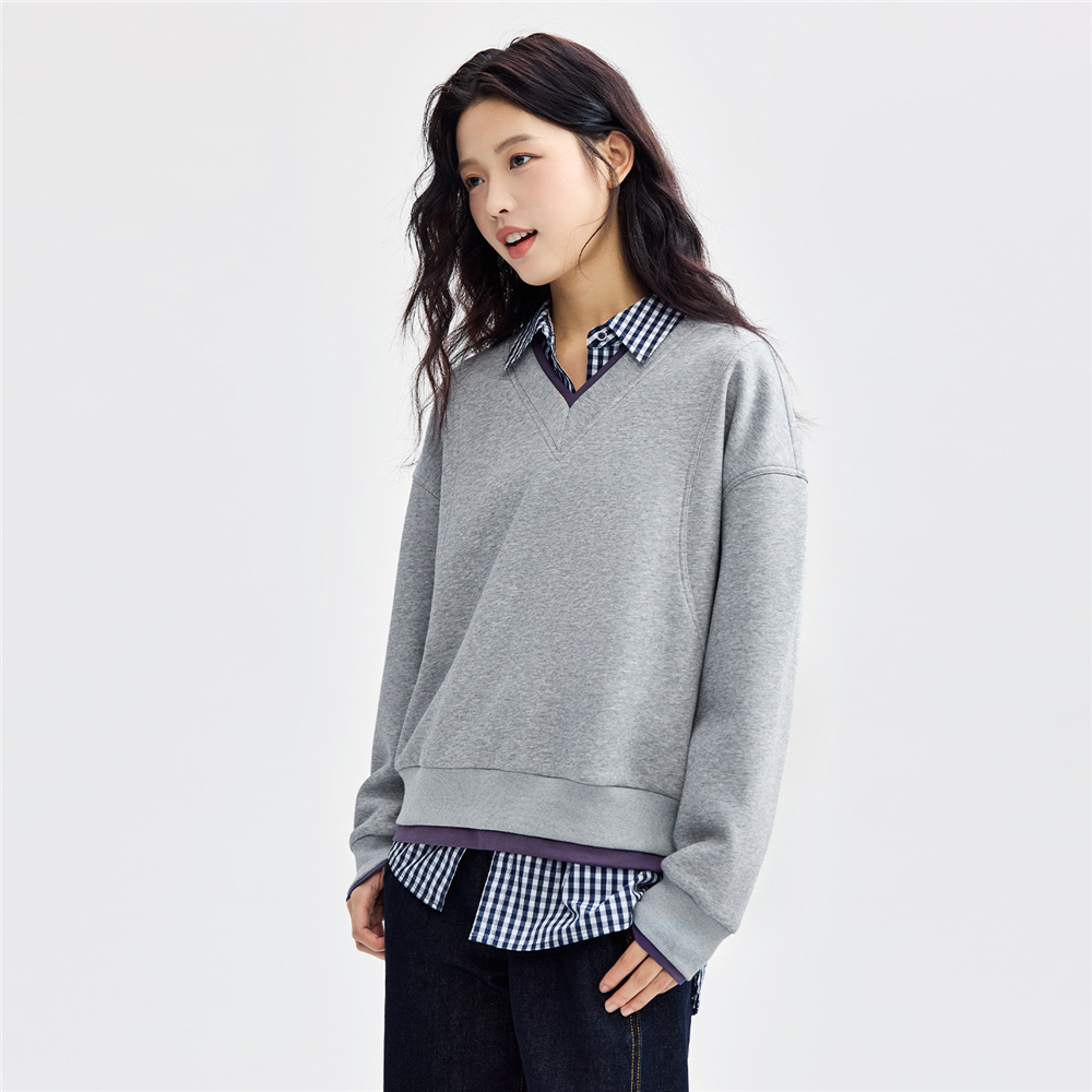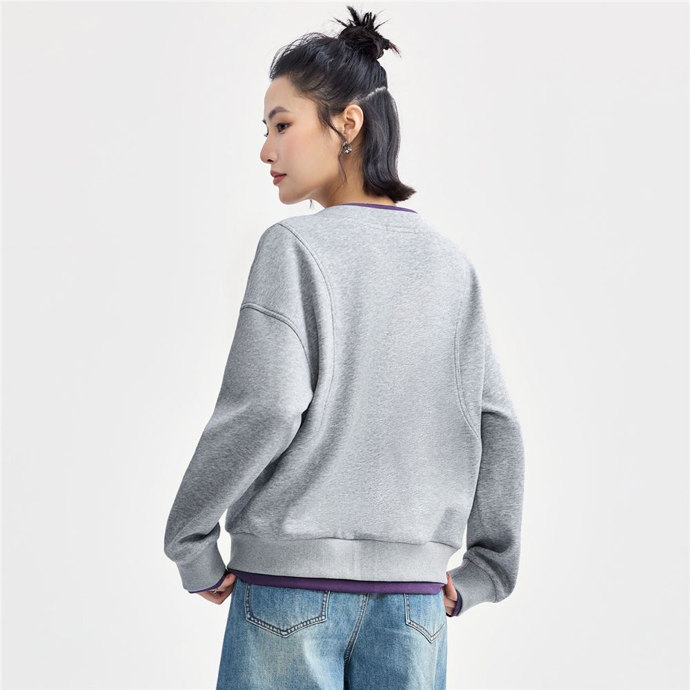 佐丹奴外套女装加绒撞色边V领破骨针织套头卫衣 18324222
