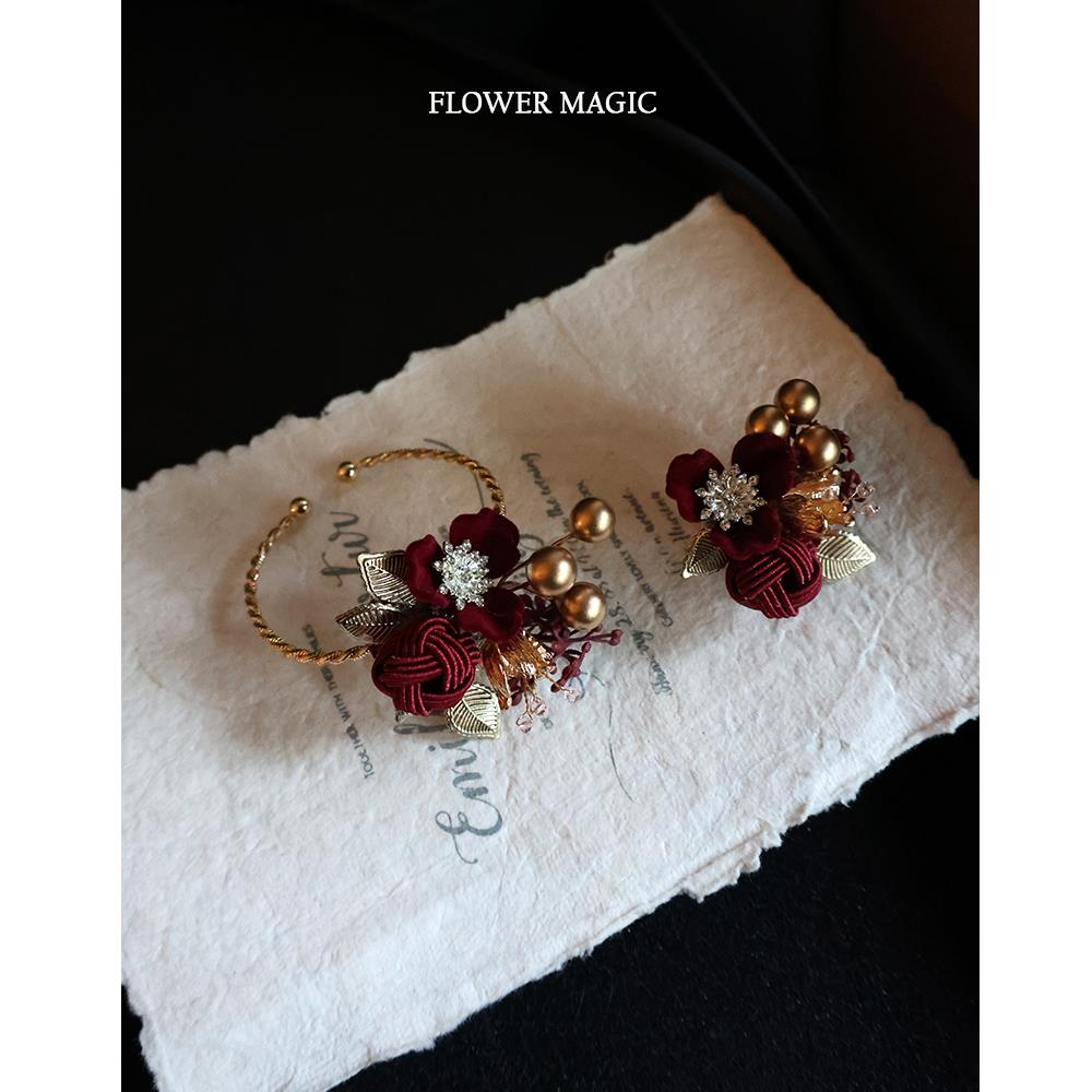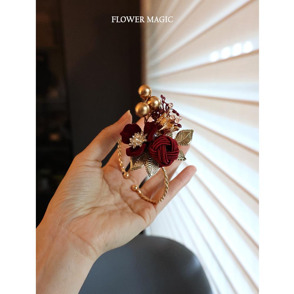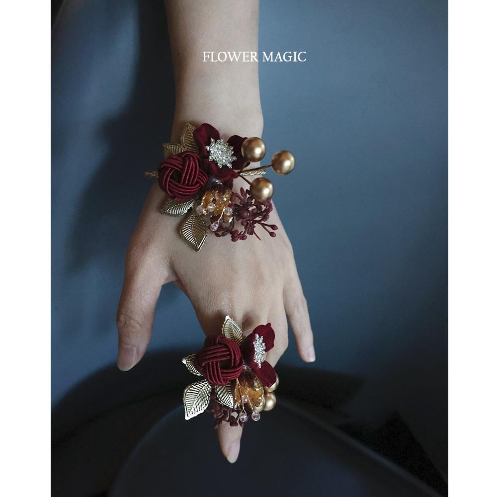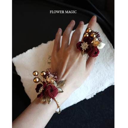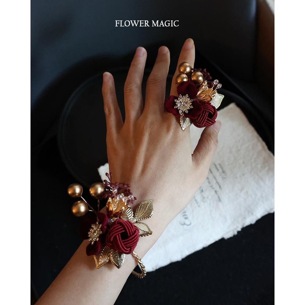 丝绒高级质感酒红色结婚礼新娘伴娘戒指花手腕花敬酒服配件手环花
