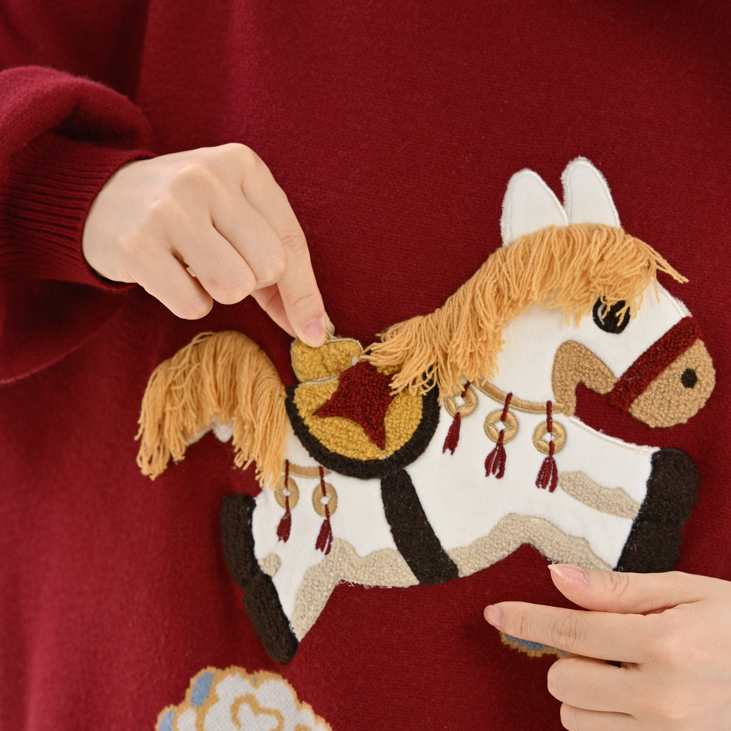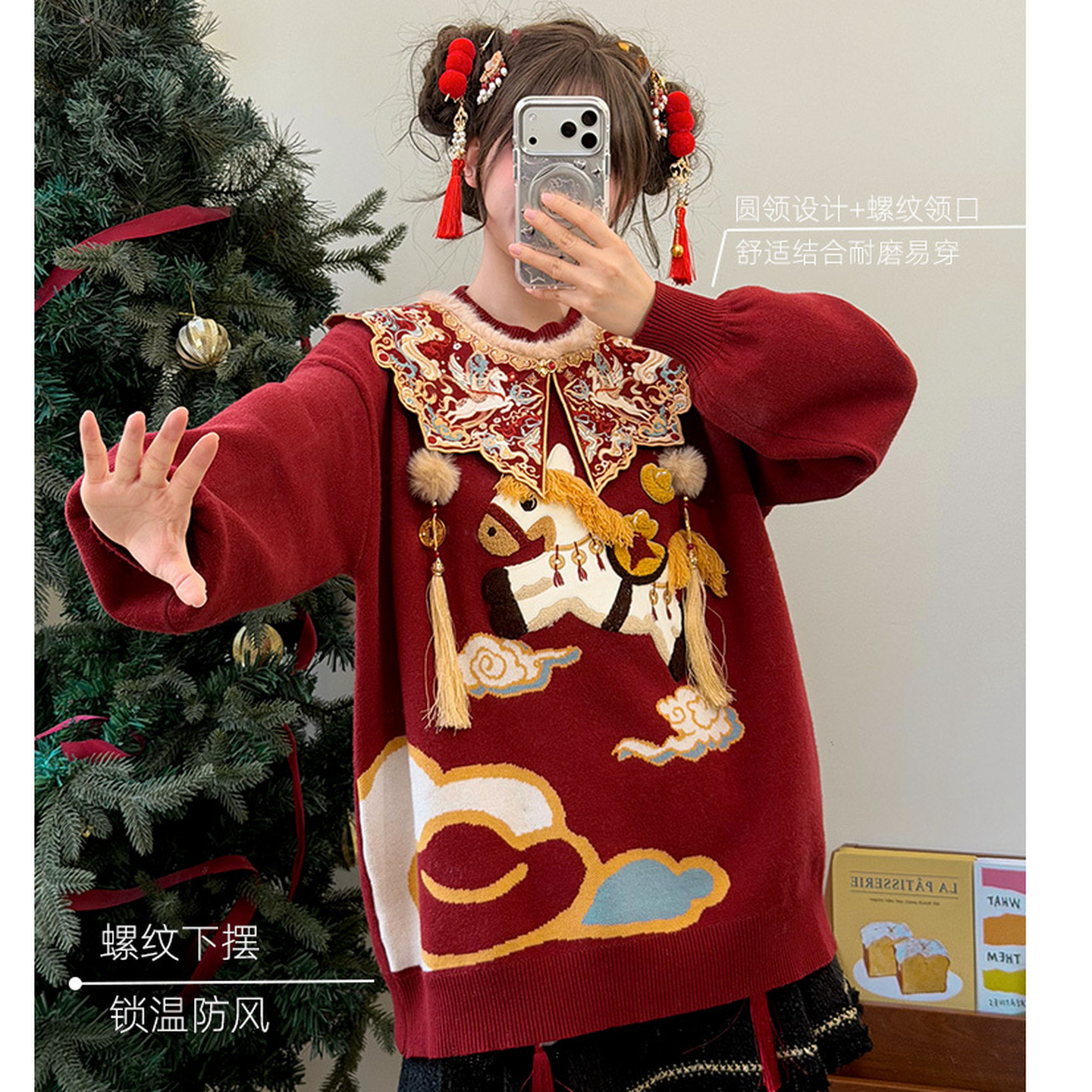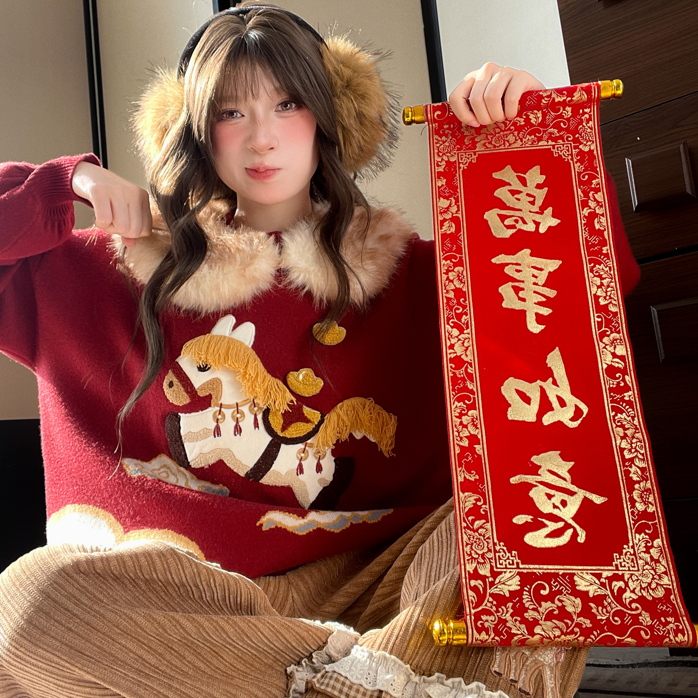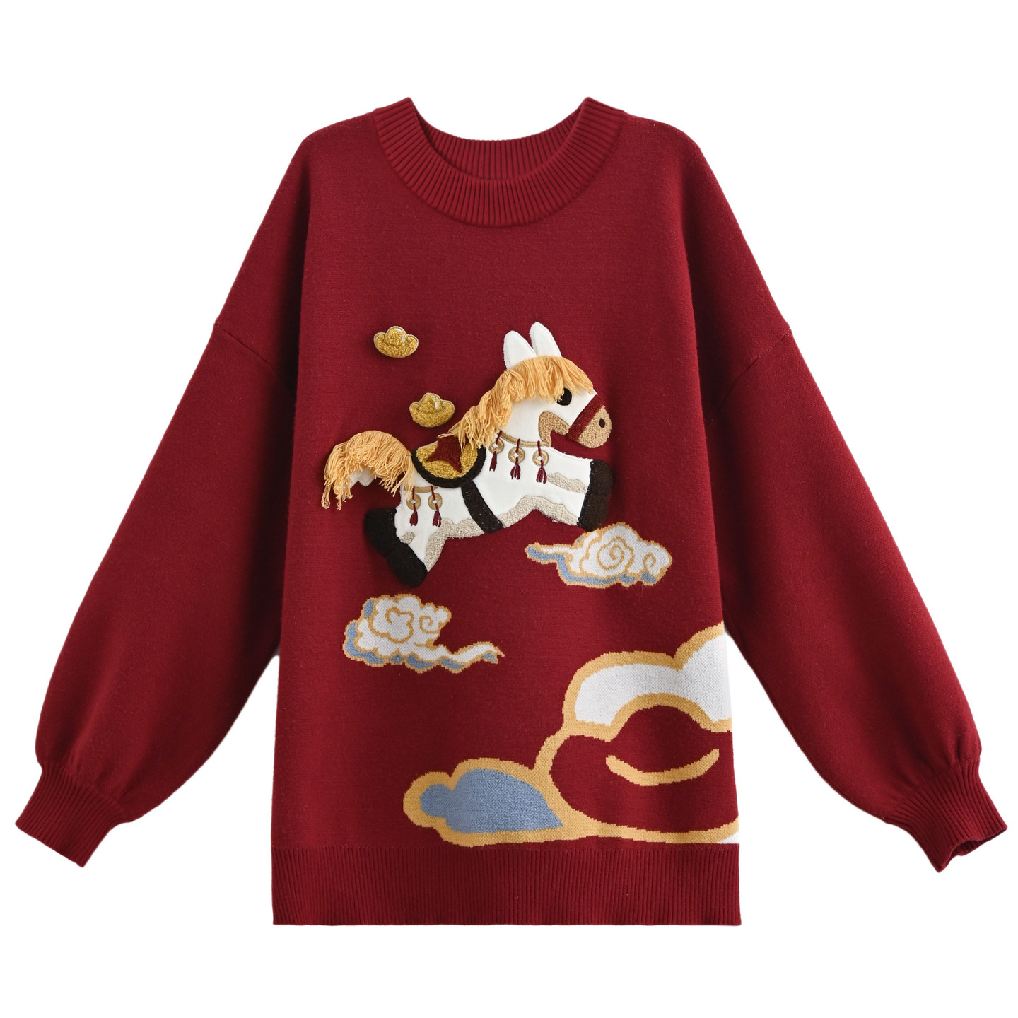 森女部落原创设计马上有钱红色新年毛衣套头内搭家庭装情侣针织衫