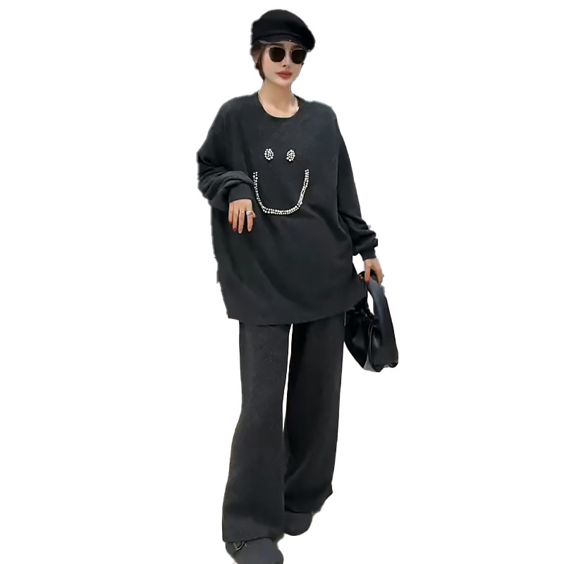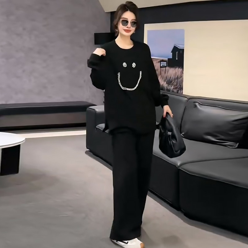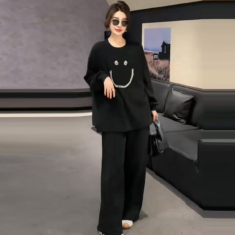 侧开叉笑脸上衣高腰休闲裤套装胖mm2026春冬新款显瘦宽松大码女装