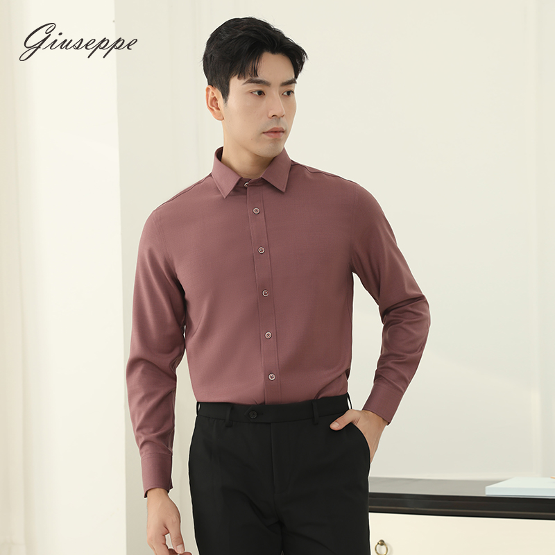 乔治白2025秋冬季衬衫羊毛男士长袖商务正装酒红通勤尖领休闲透气