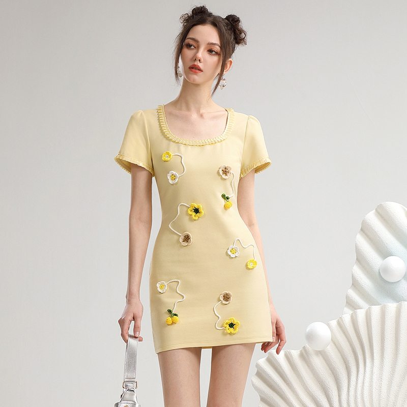 茬客甜美浪漫连衣裙25年夏季新款钩花修身显瘦喇叭袖白色针织裙女