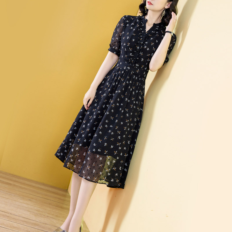微胖妈妈a字连衣裙2024夏季新款40岁木耳边雪纺收腰显瘦女装裙子