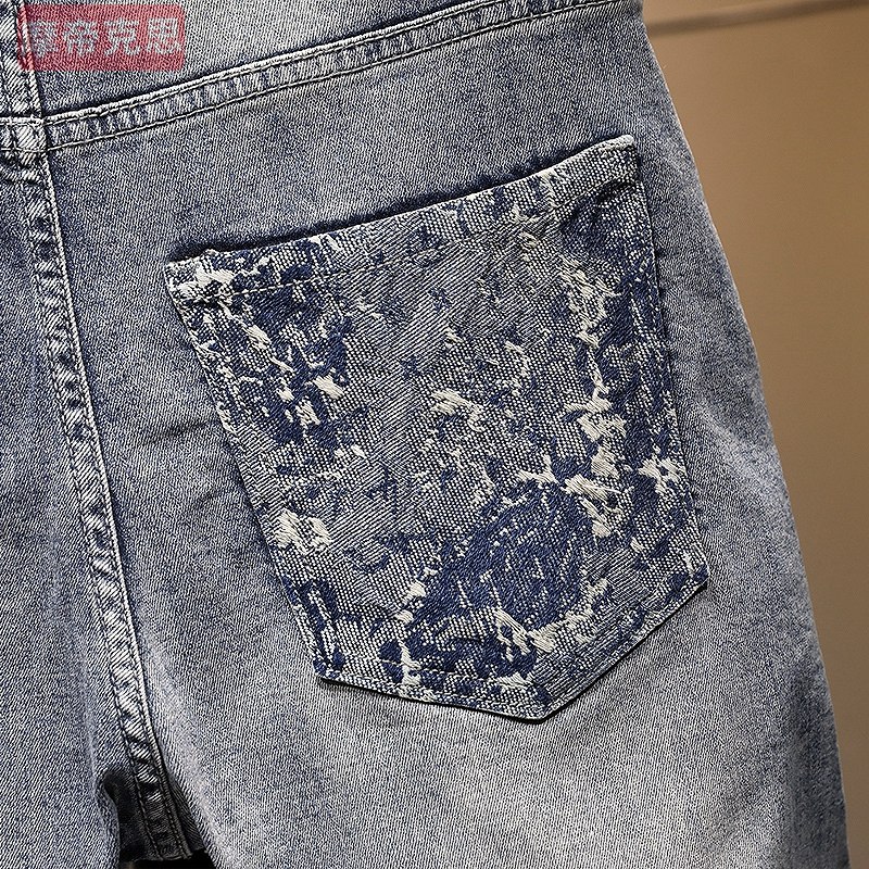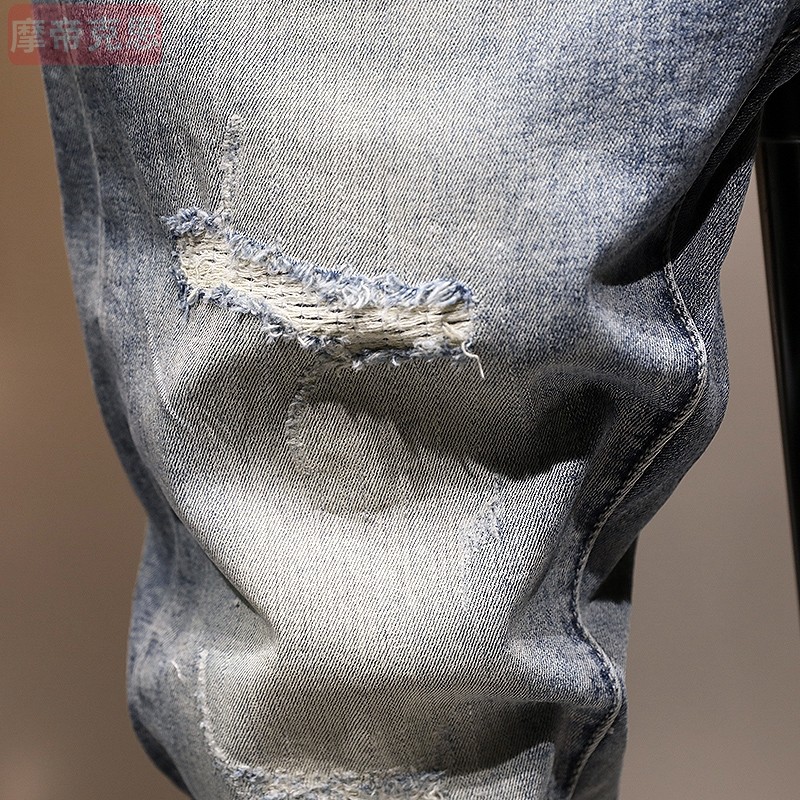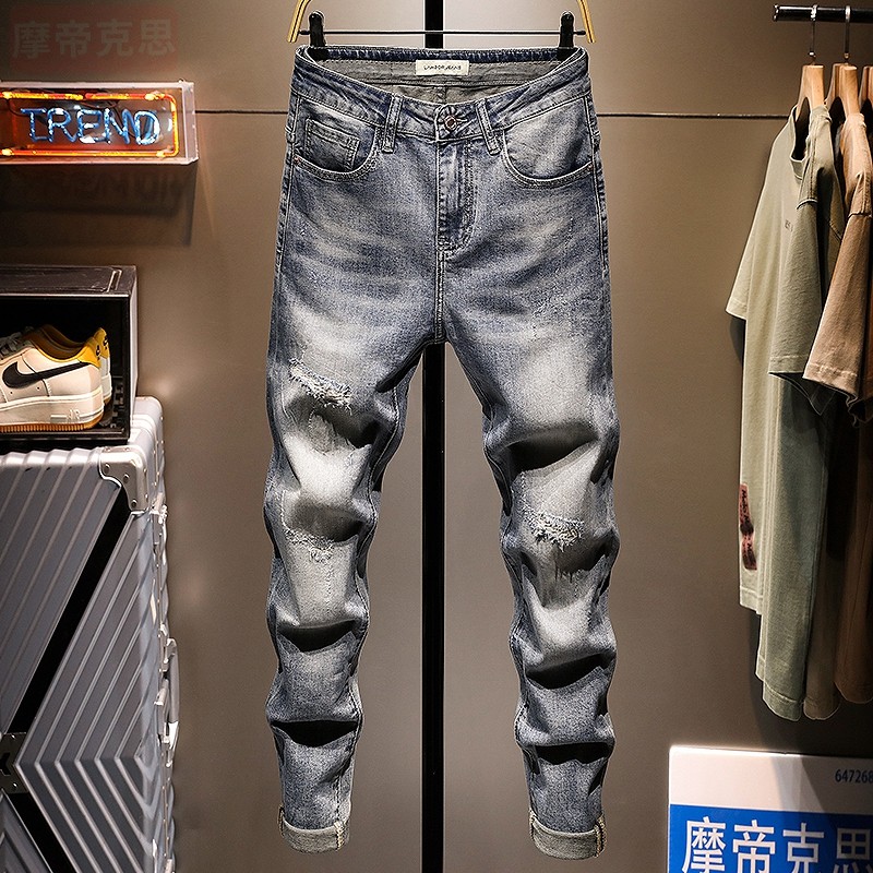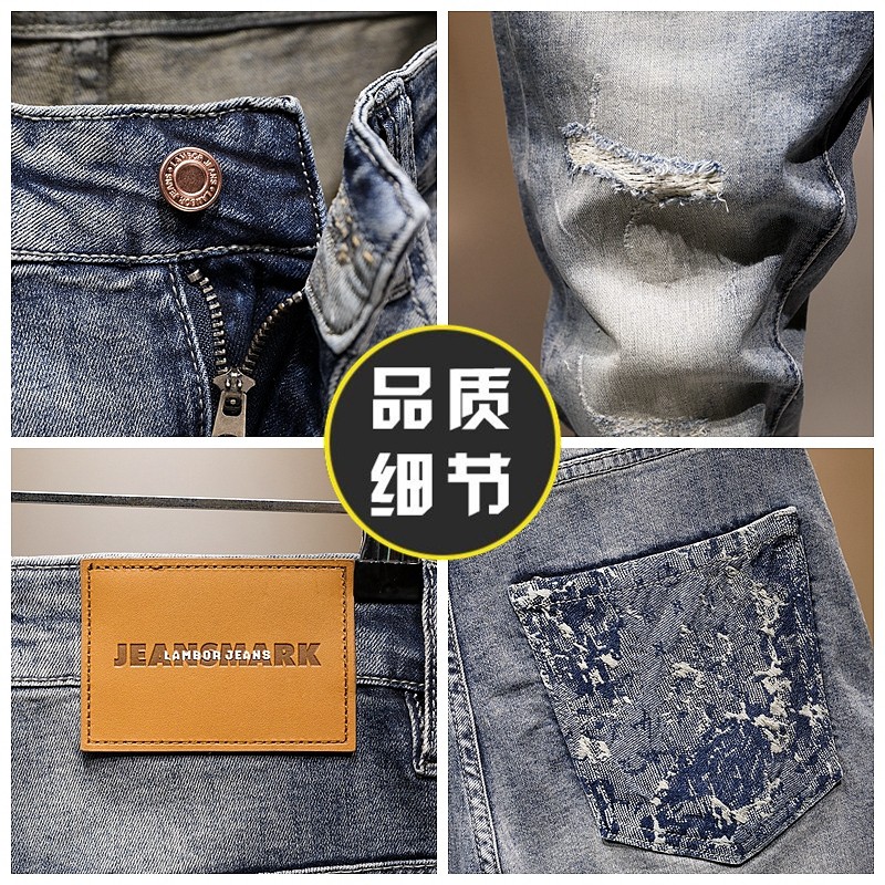后袋刺绣九分牛仔裤男士修身小脚潮牌破洞补丁弹力韩版百搭9分裤