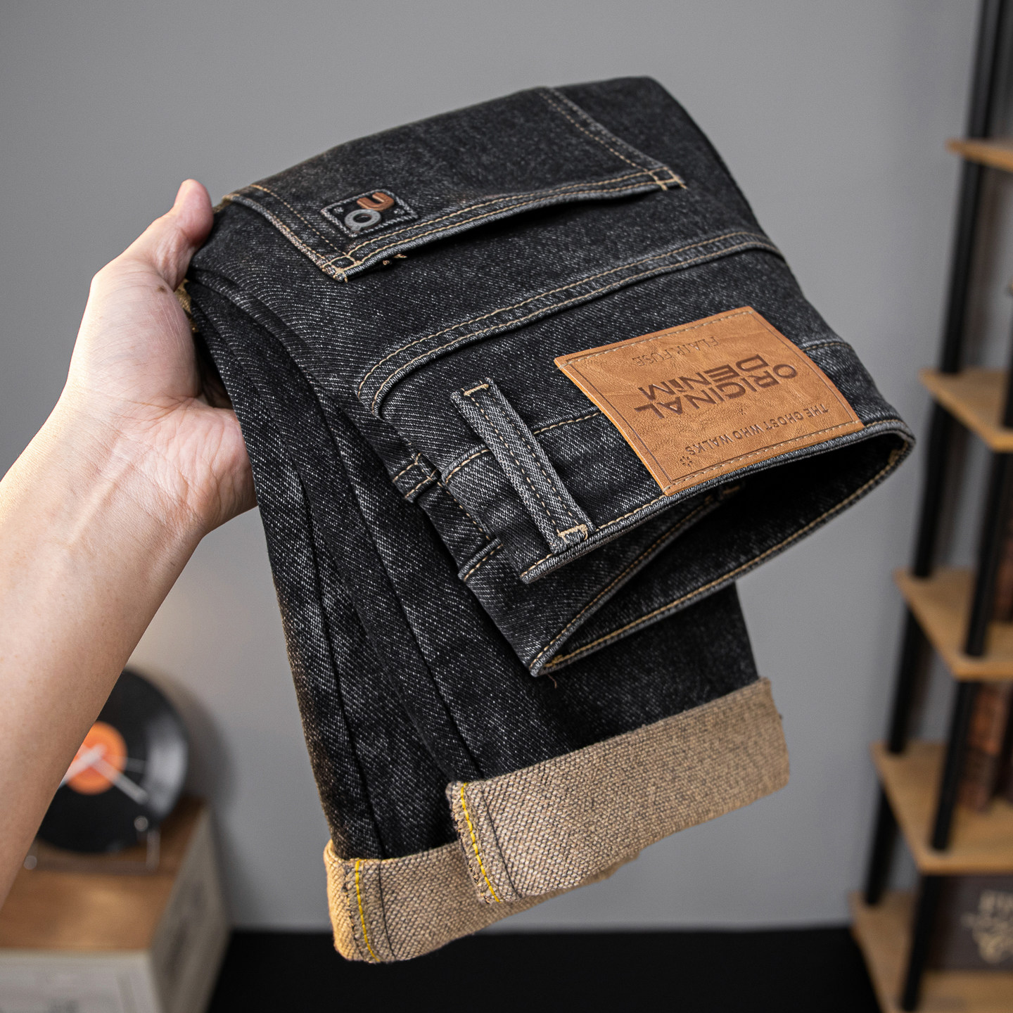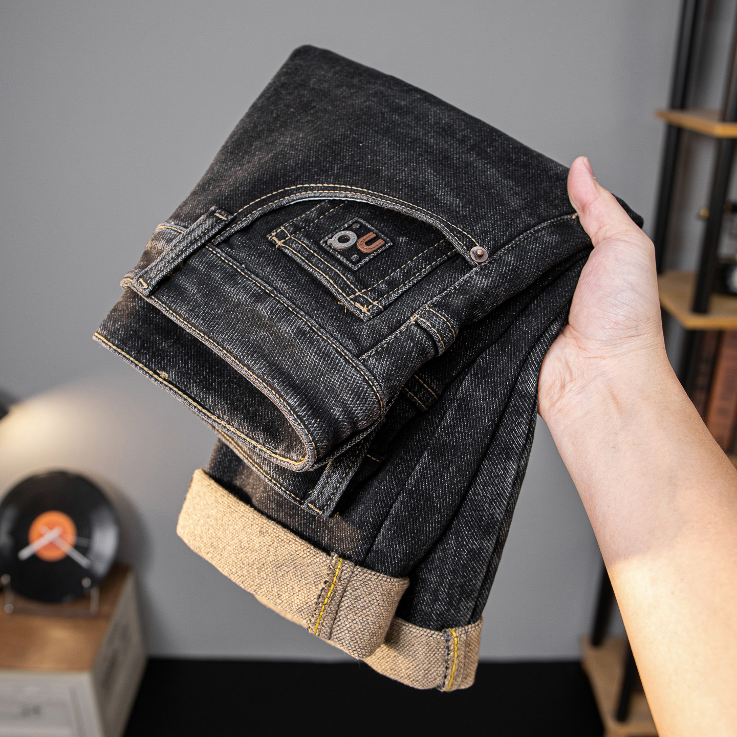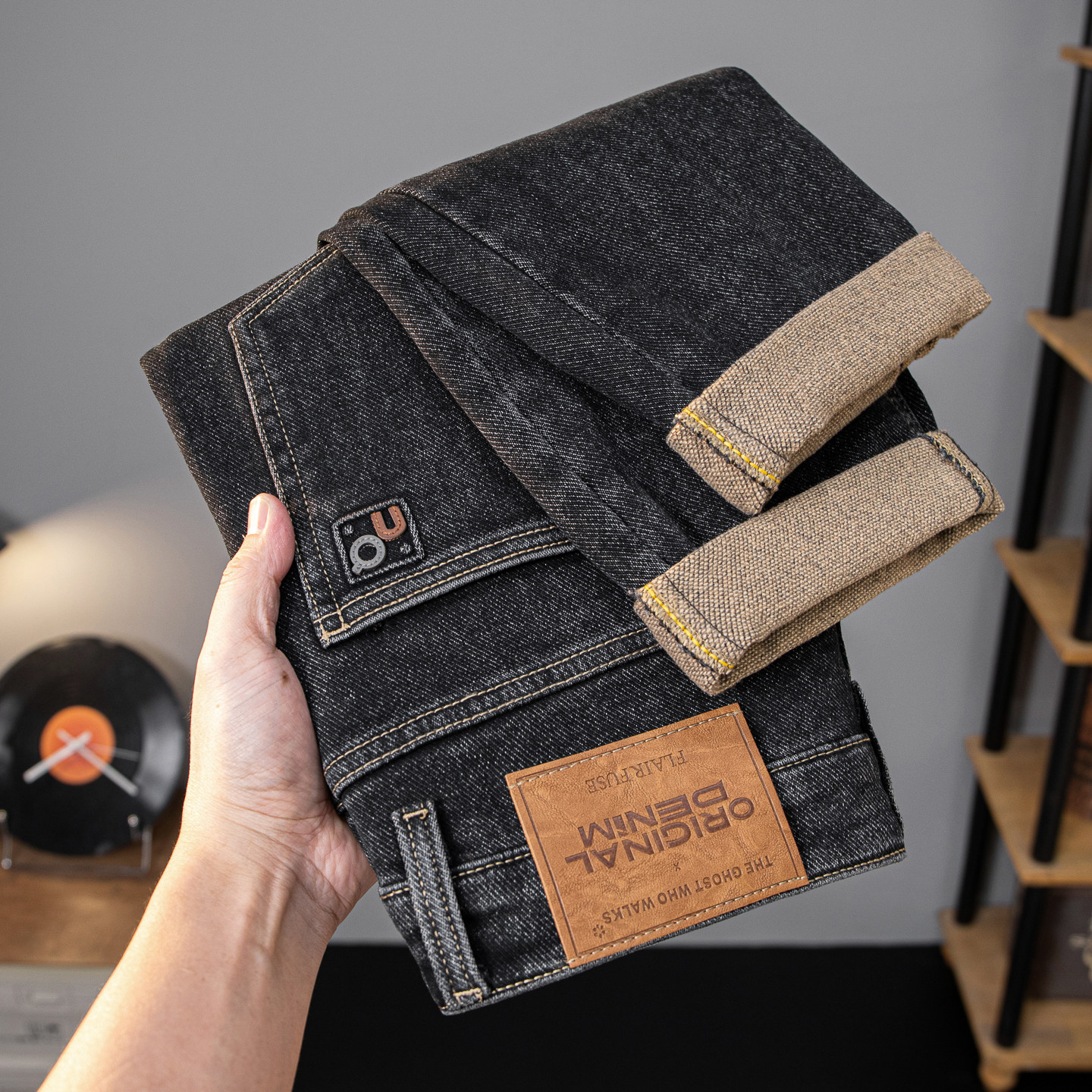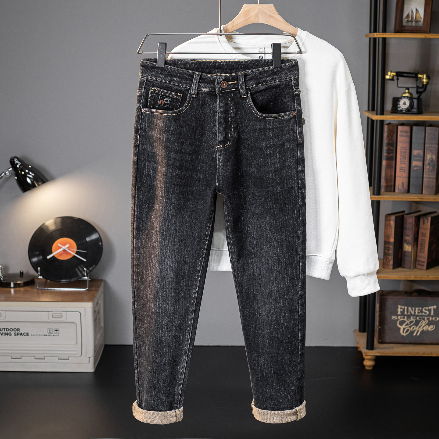 高端黑色磨毛牛仔裤男士冬季裤子