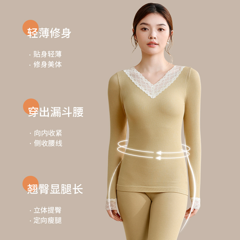 秋衣秋裤女士V领蕾丝发热羊毛修身美体打底保暖内衣套装2025新款