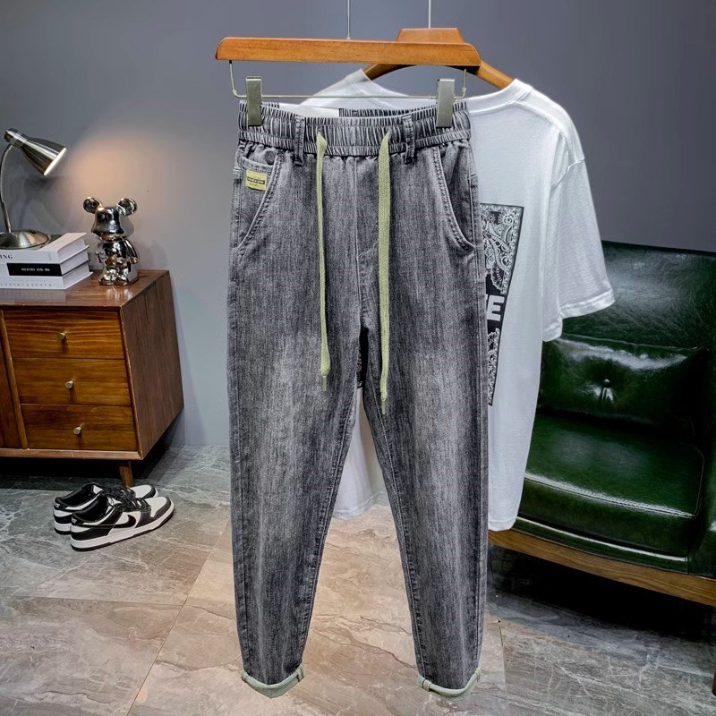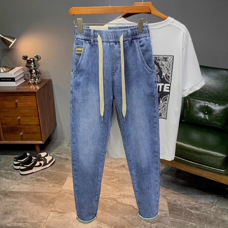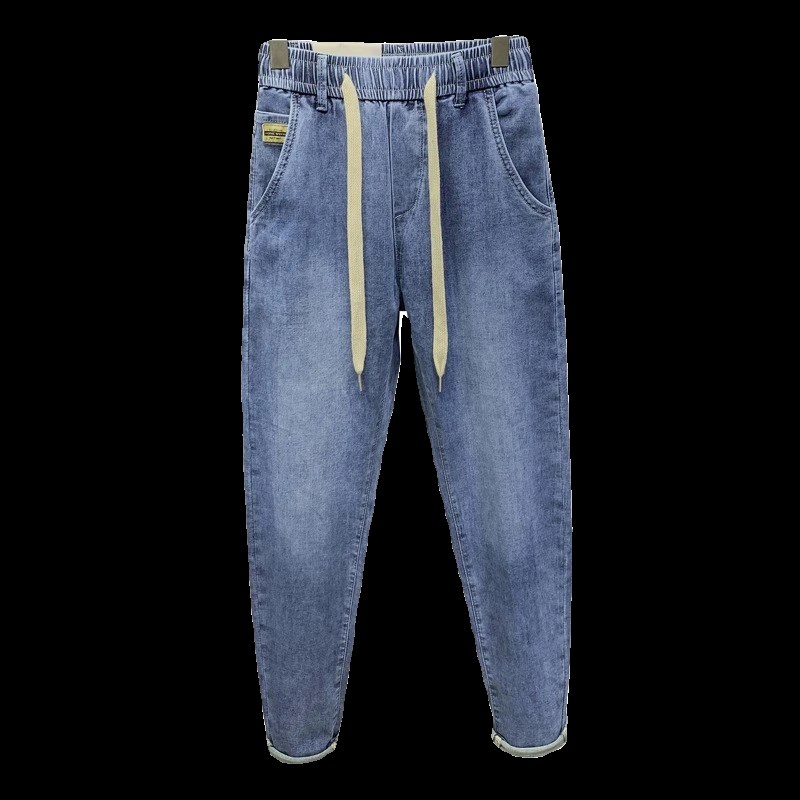 夏季新款宽松弹力小脚牛仔裤男潮牌松紧腰无铁休闲百搭哈伦裤九分