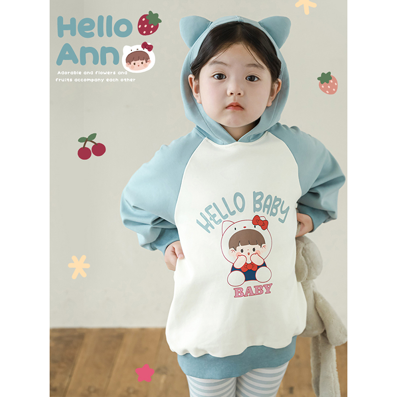 幼悠女童安安宝贝印花连帽卫衣春秋洋气可爱醒目撞色插肩袖上衣潮