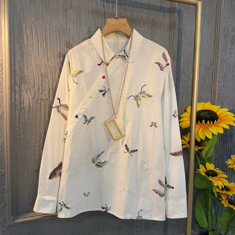 大码女装立领刺绣花朵国风马甲胖妹妹韩版秋冬款百搭蝴蝶长袖衬衫