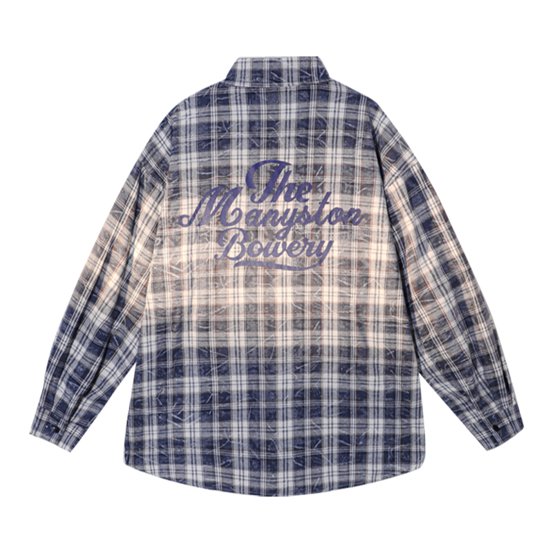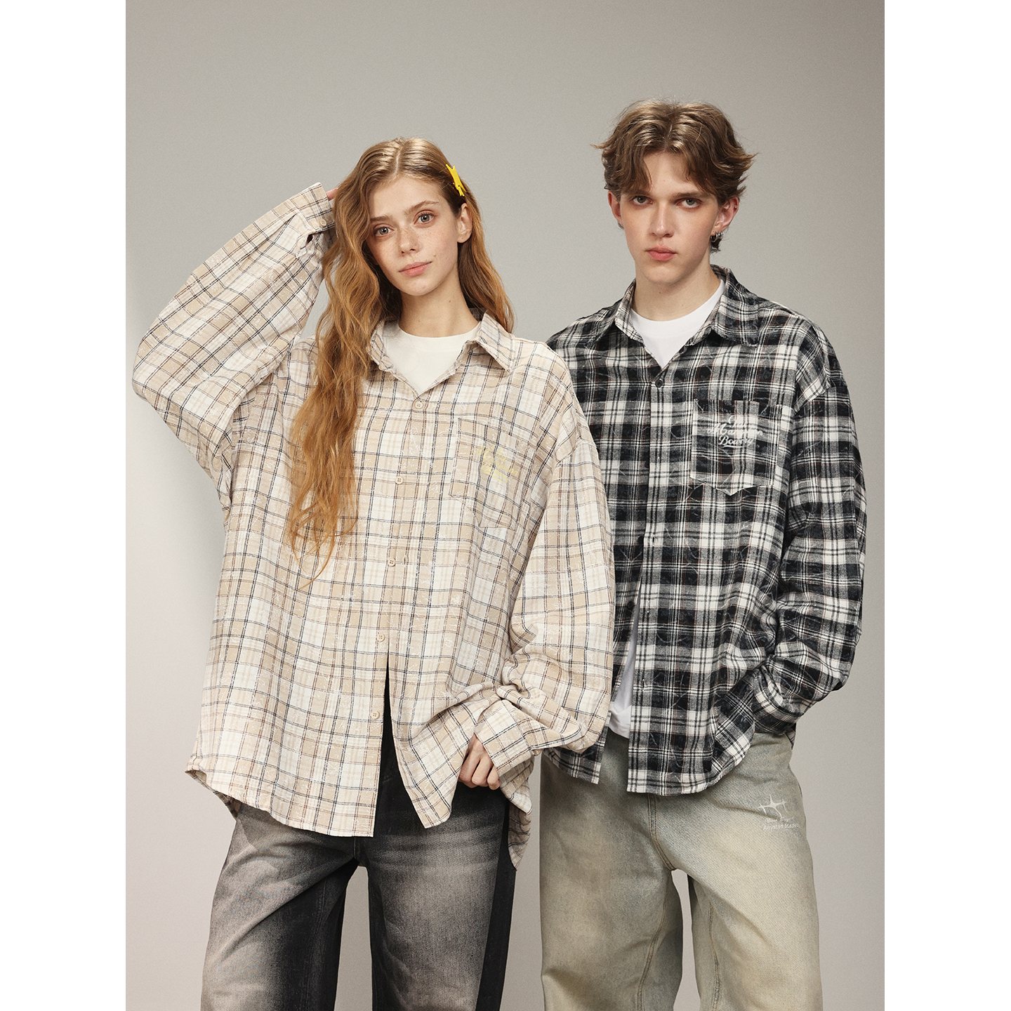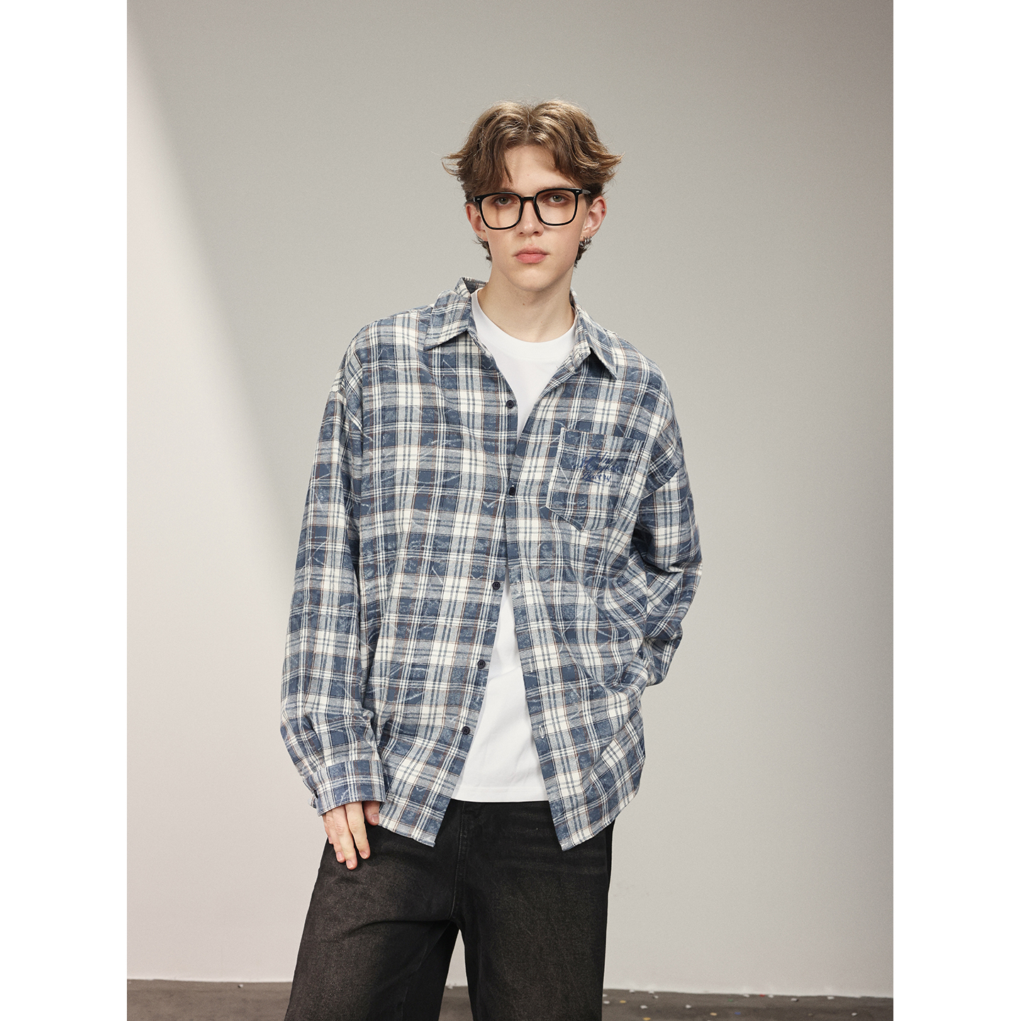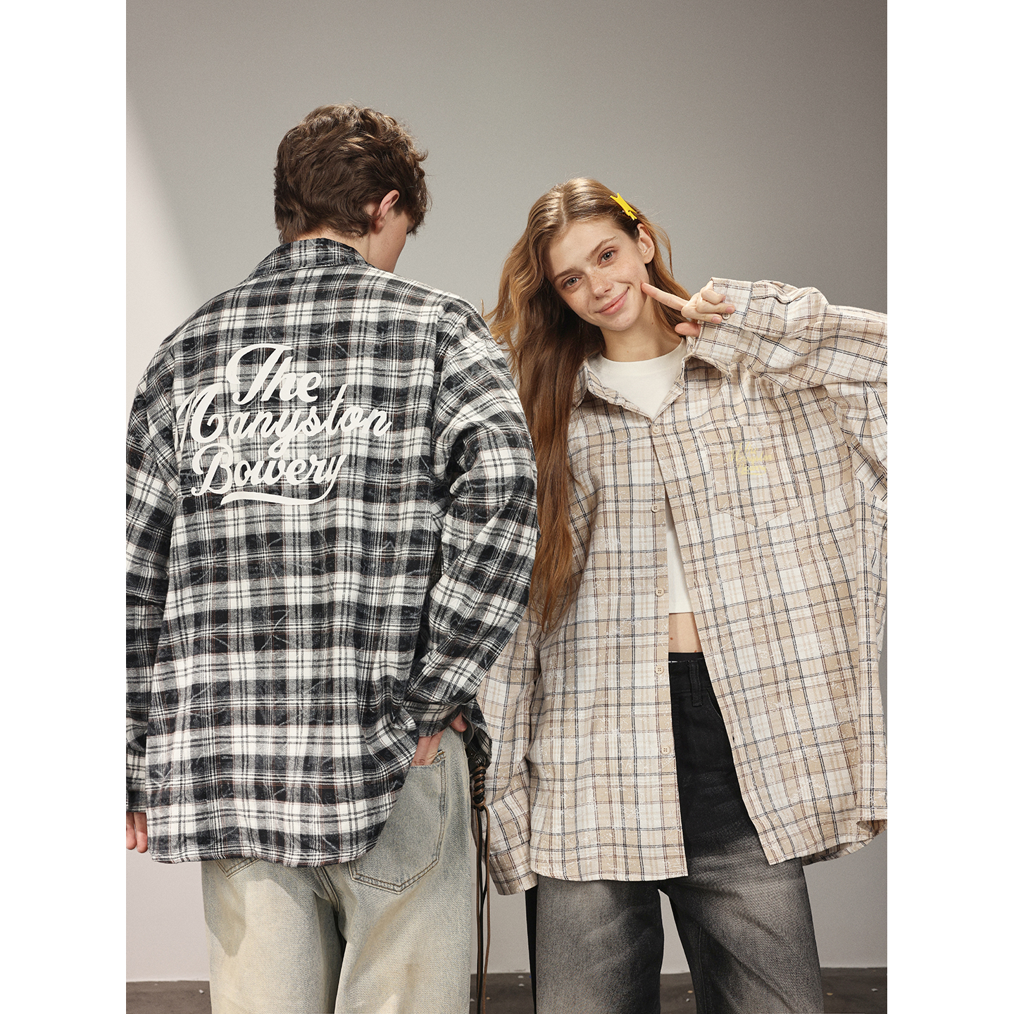 MANYSTON 美式纯棉翻领格子衬衫男生款春秋季衬衣青少年宽松外套