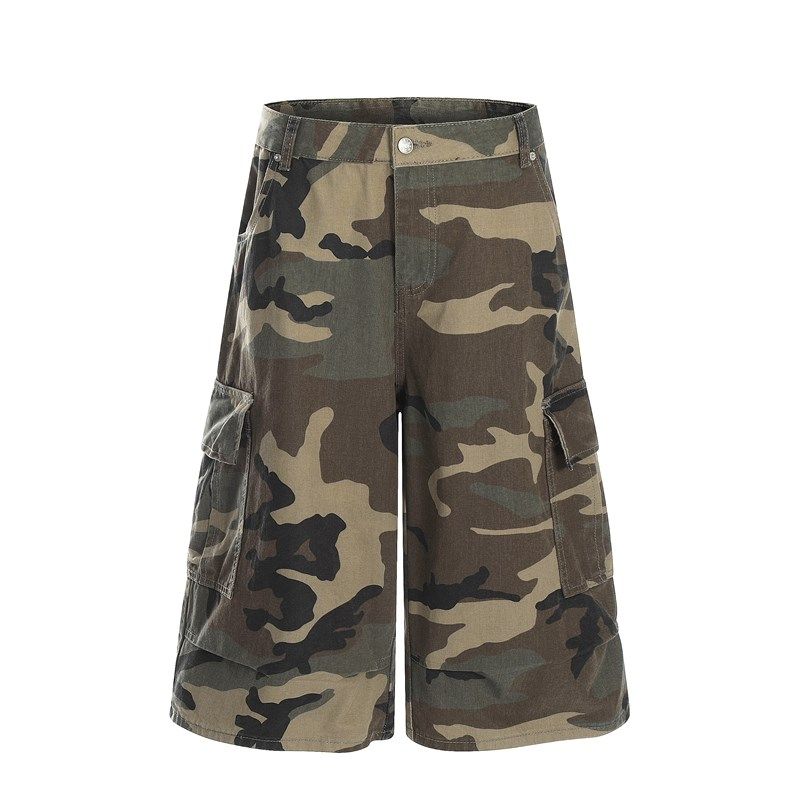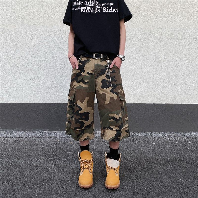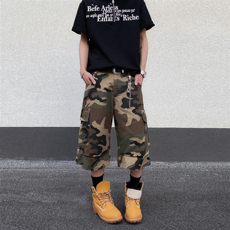 美式复古多口袋工装迷彩牛仔短裤男宽松阔腿高街夏季七分休闲裤子