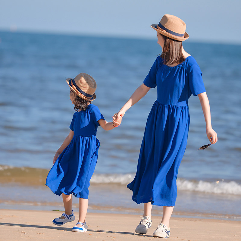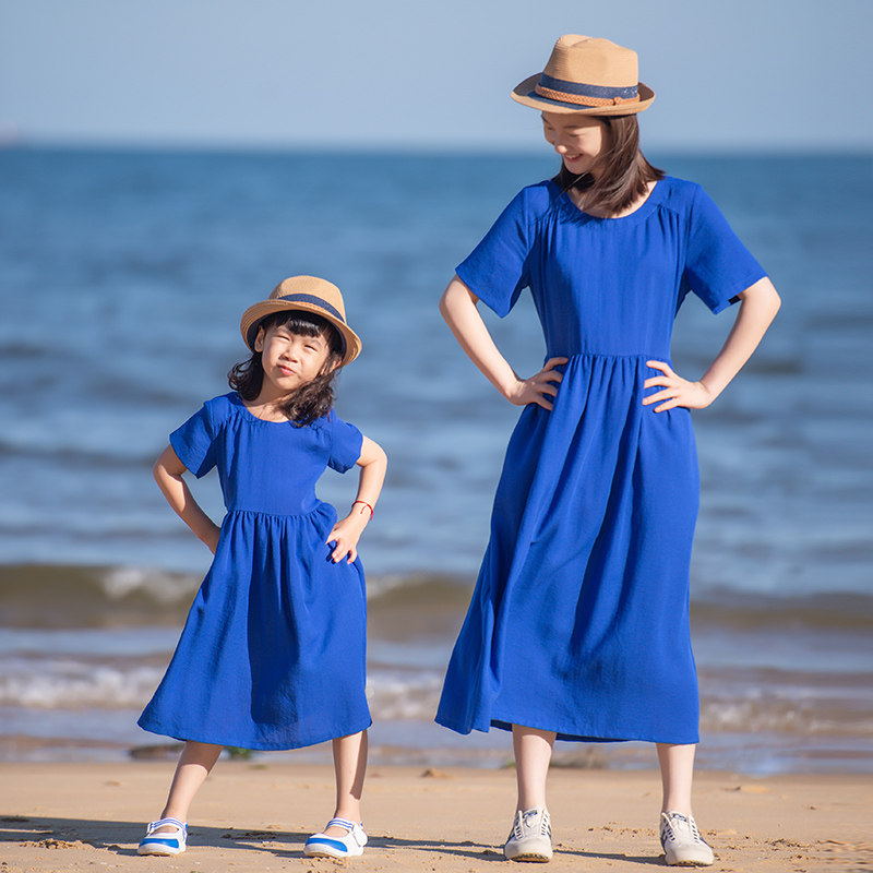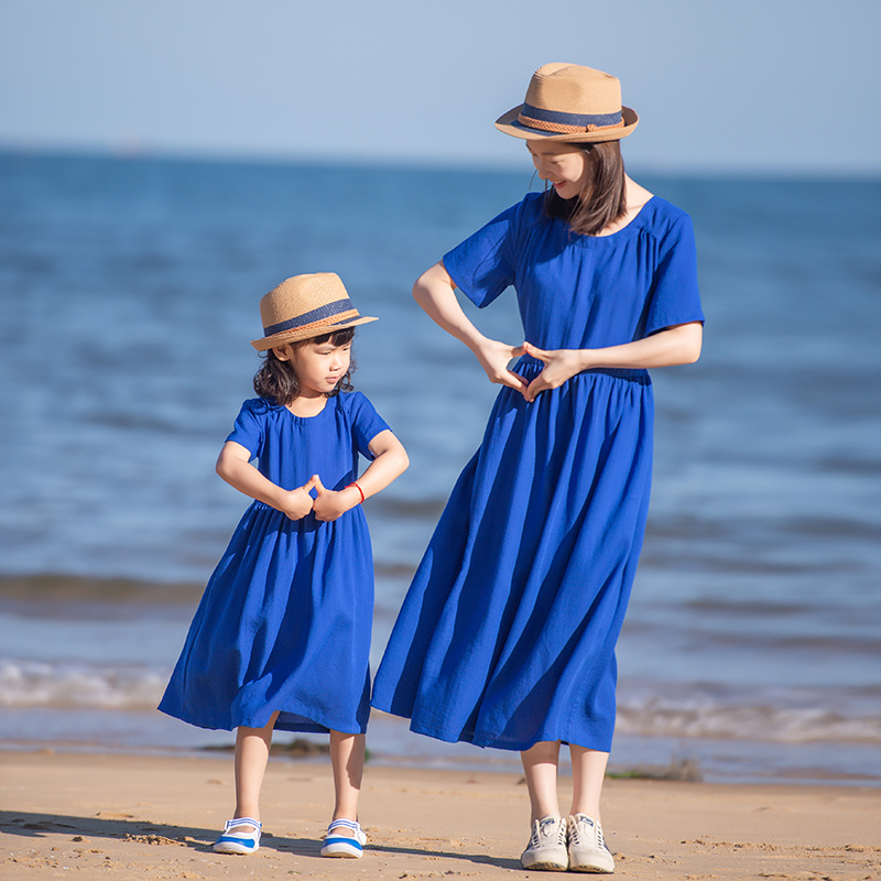 小乐往原创亲子装124课 夏宝蓝色文艺母女装海边度假拍照连衣裙