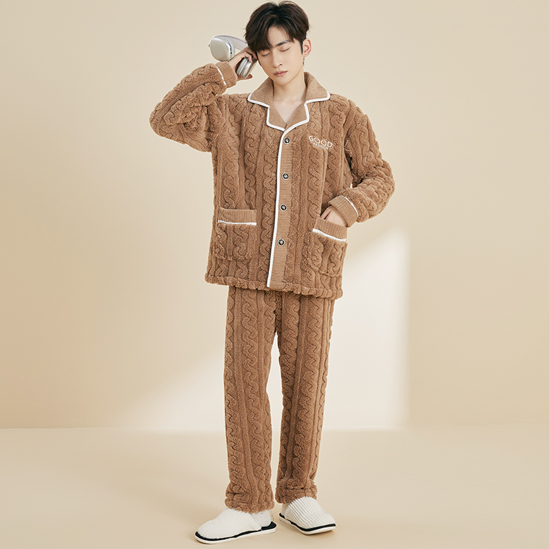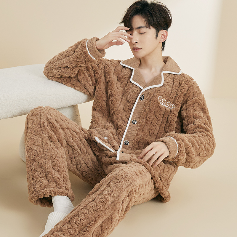 男士睡衣秋款纯色秋季新款男冬季高级感珊瑚绒男款加绒加厚家居服