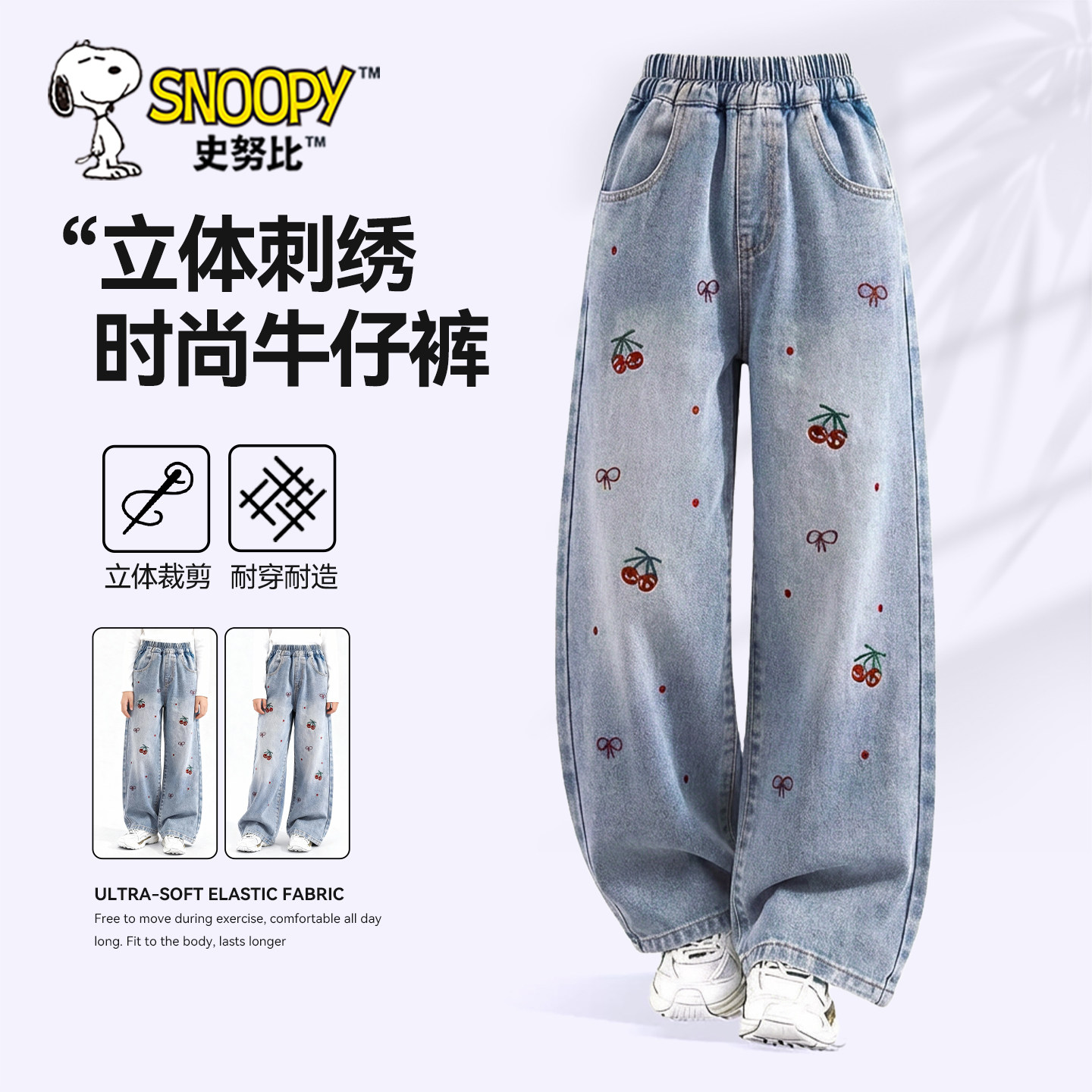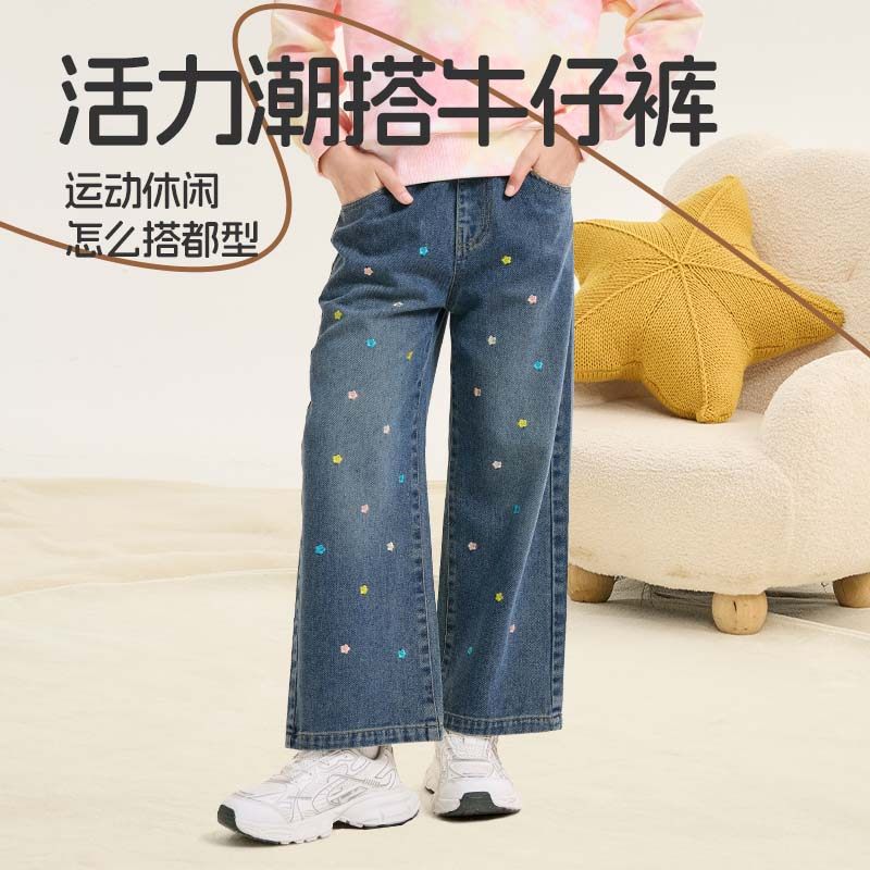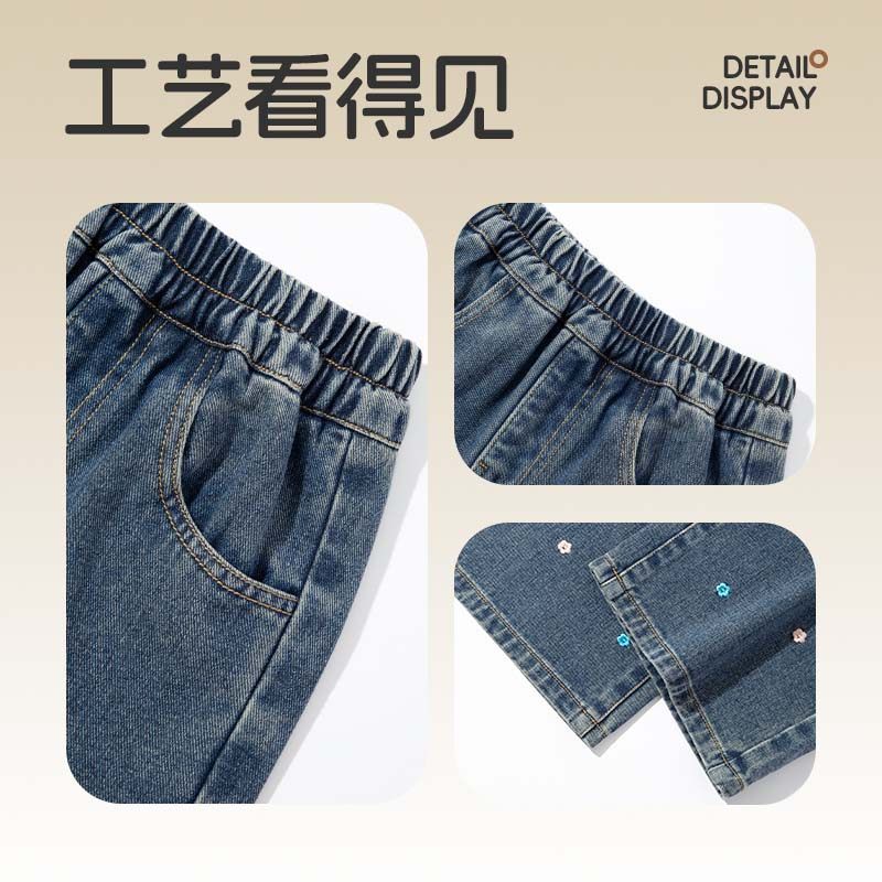 史努比女童裤子牛仔裤春秋款2026新款女孩刺绣花朵长裤儿童阔腿裤