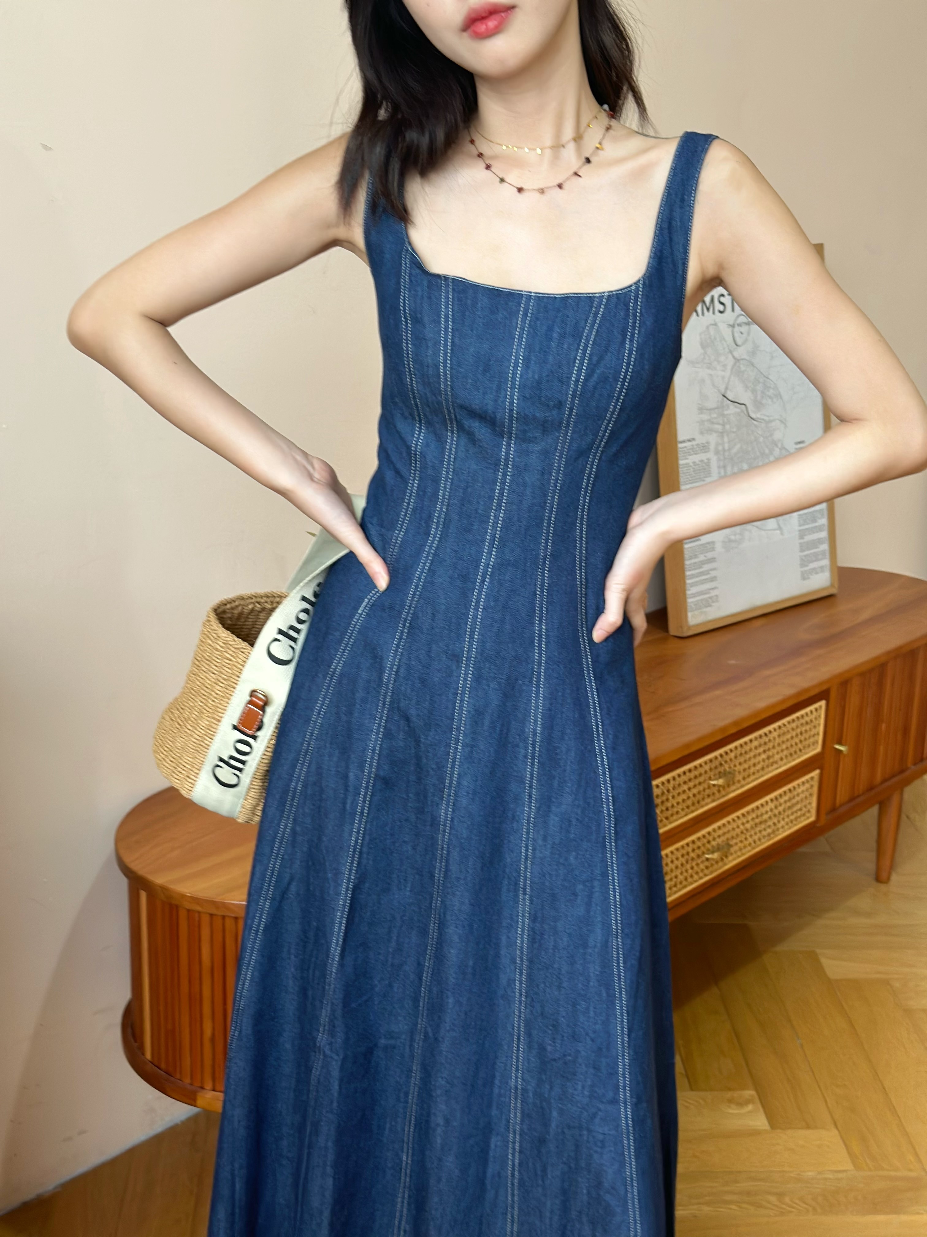 优雅赫本风牛仔背心裙中长款方领a字裙高腰拉链23夏季吊带连衣裙