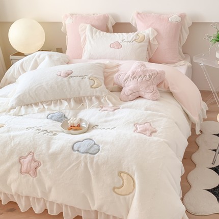 可爱云朵兔兔绒刺绣四件套加厚牛奶绒床上用品秋冬珊瑚绒床单被套