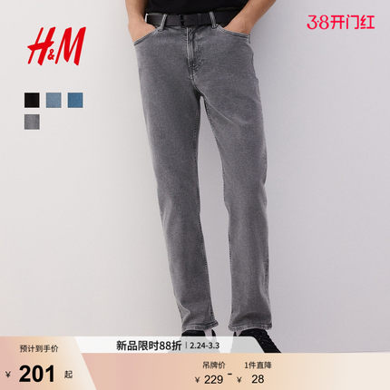 HM男装牛仔裤春季复古水洗牛仔裤中腰弹力棉质5袋式长裤1008549