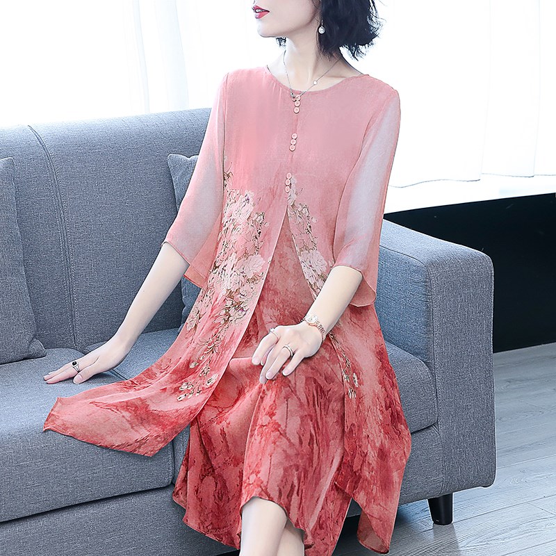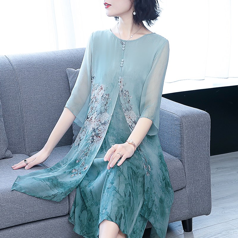 现货速发母亲节妈妈夏装真丝洋气连衣裙宽松大码衣服50岁中老年新