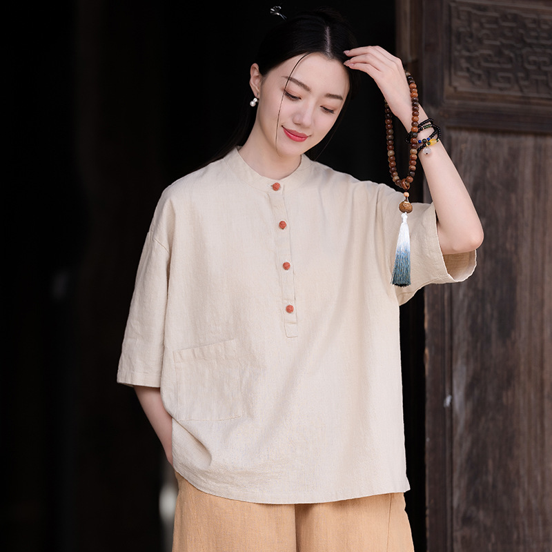 2025秋季女式棉麻长袖T恤衫文艺复古撞色盘扣新中式苎麻上衣茶服