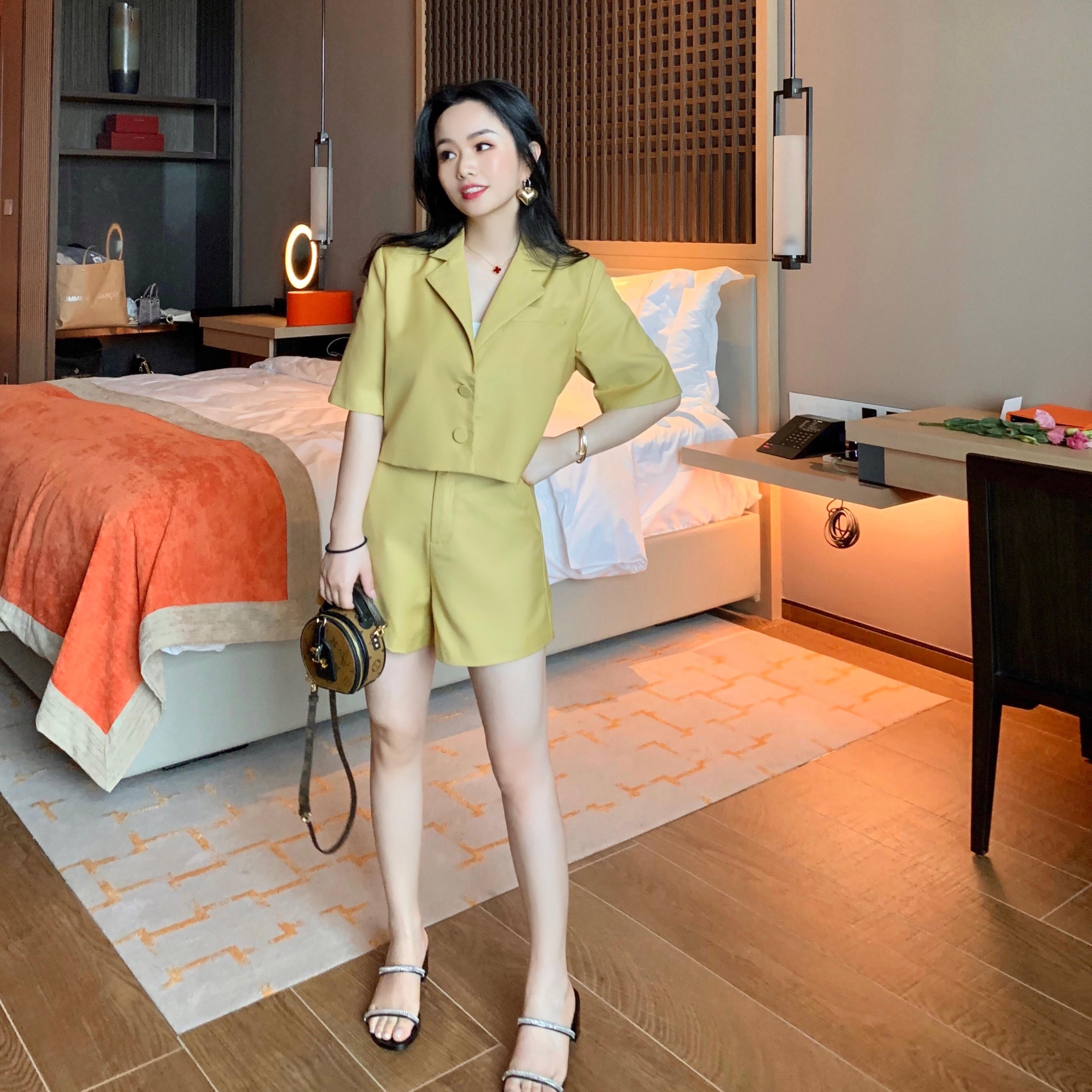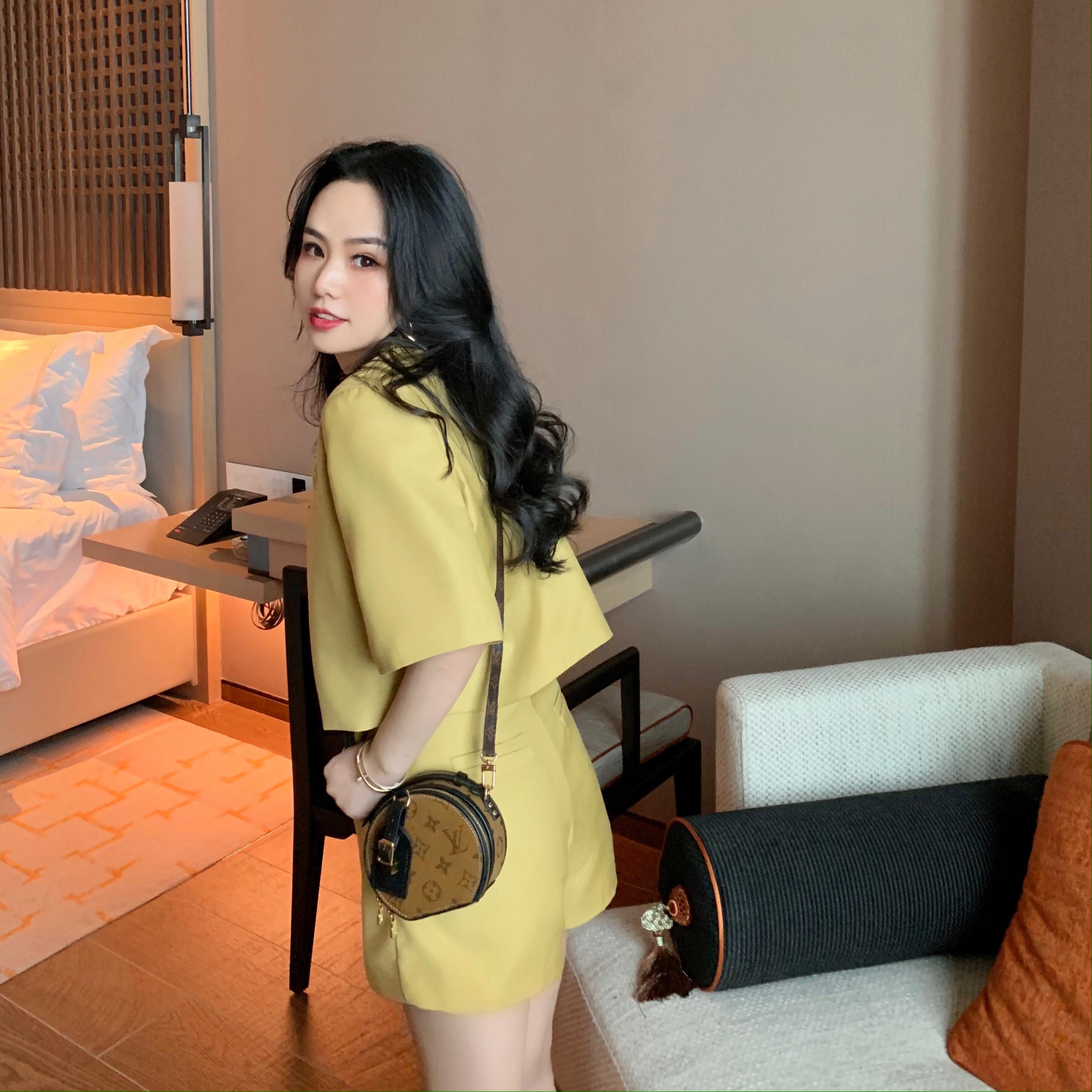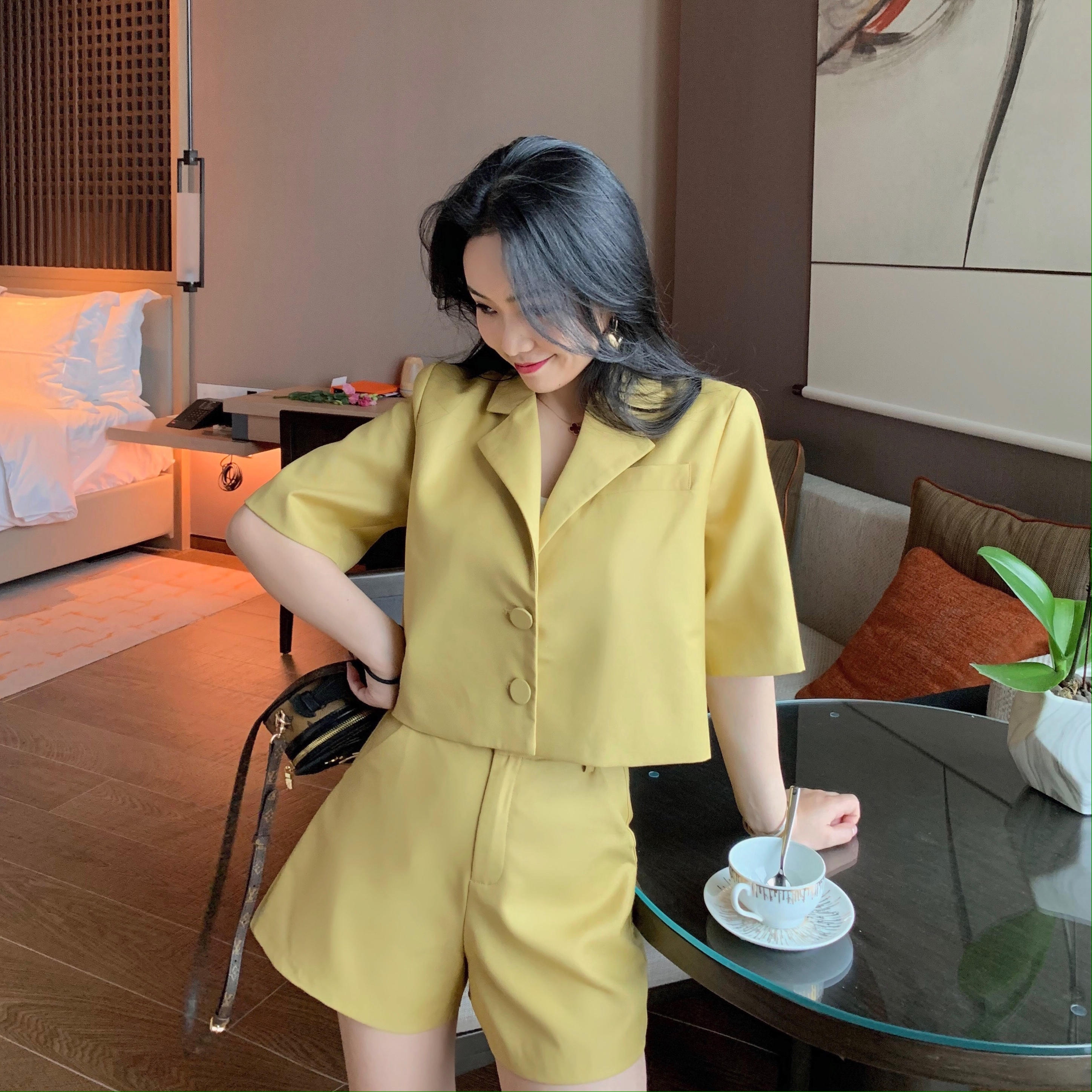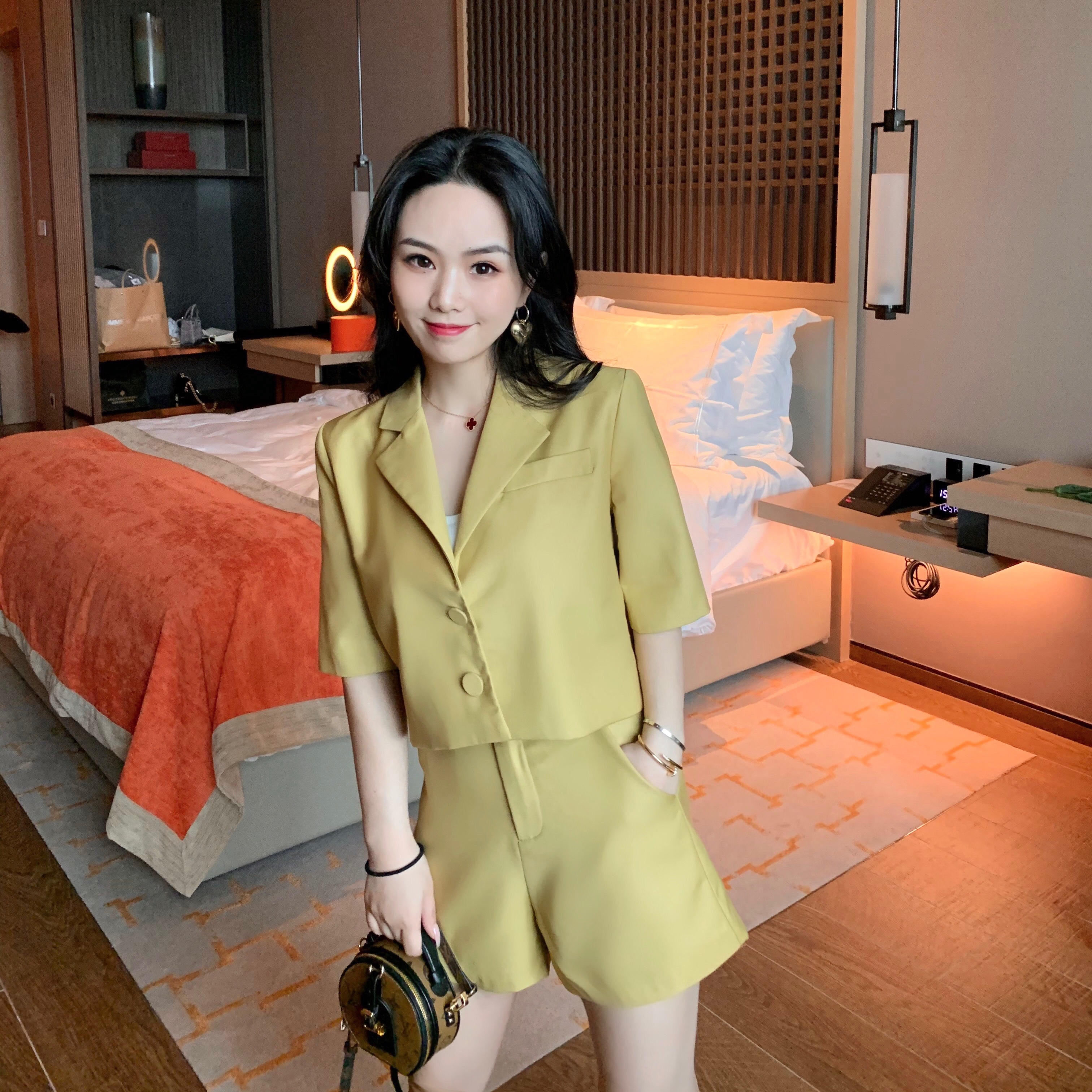 小个子短裤西装套装女2021夏季洋气时尚姜黄色质感短袖西装两件套