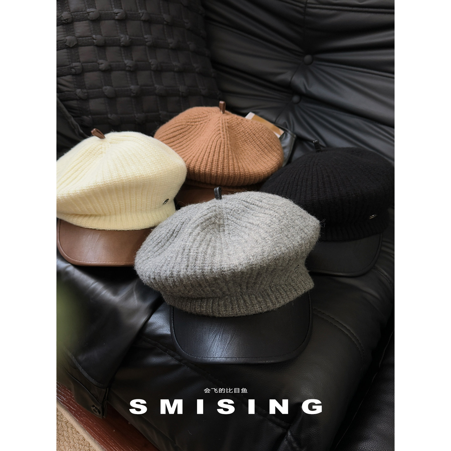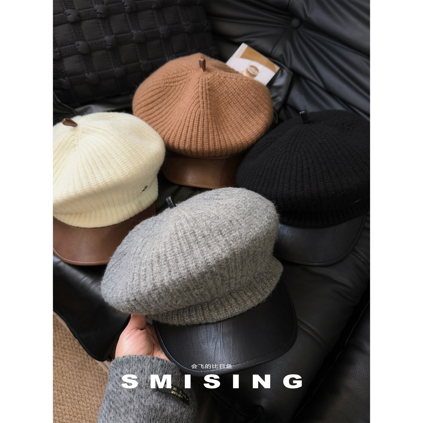 易梦玲同款复古百搭针织拼接皮质贝雷帽女秋冬高品质气质贝雷帽子