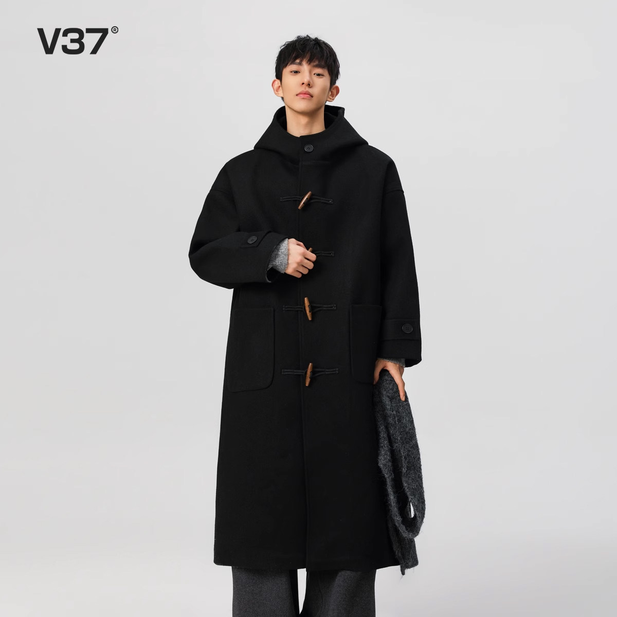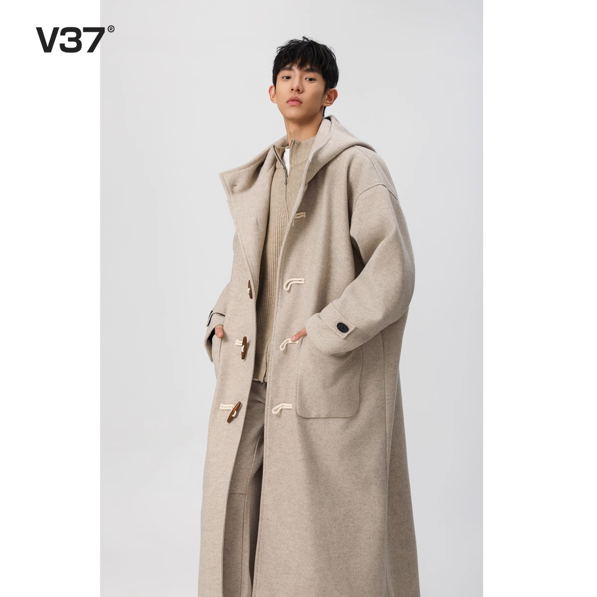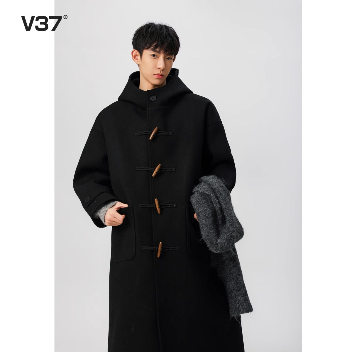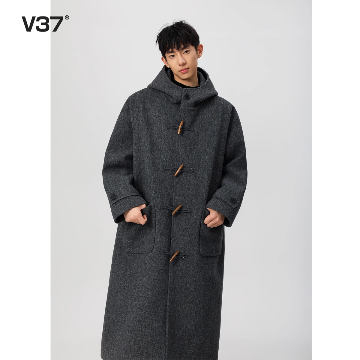 V37高级感牛角扣毛呢大衣男2026春秋季加厚保暖长款呢子连帽外套