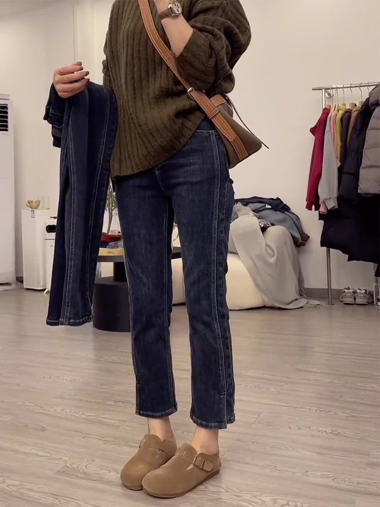 大码梨型身材高腰直筒牛仔裤女秋季胖妹妹mm显瘦弹力九分烟管裤子