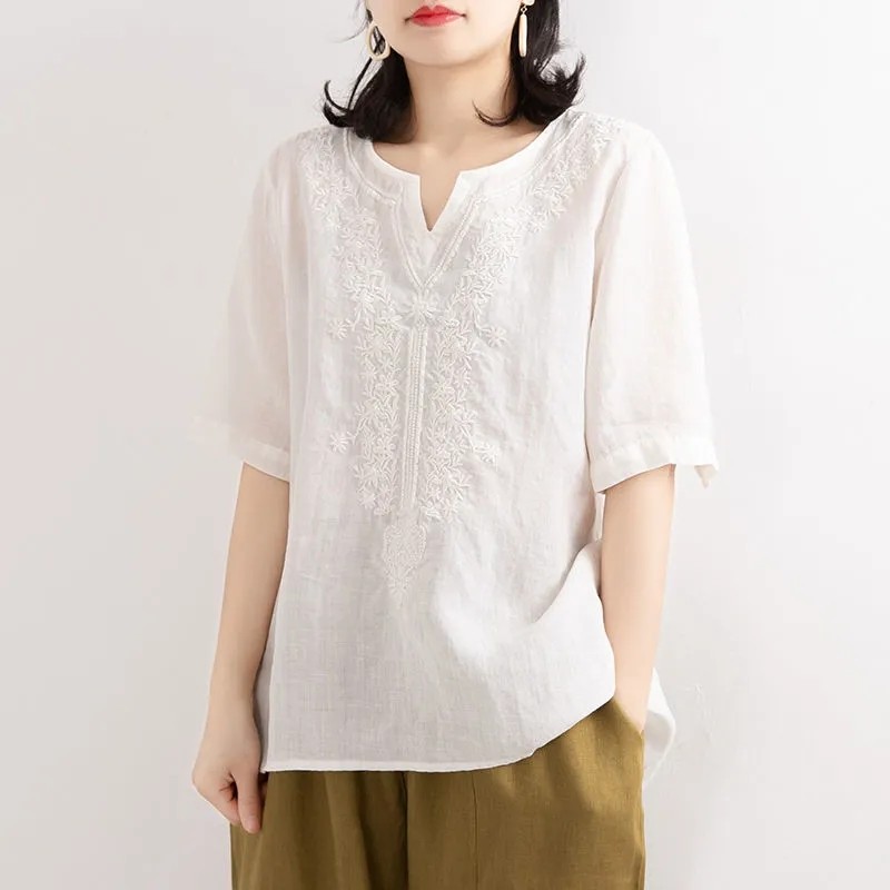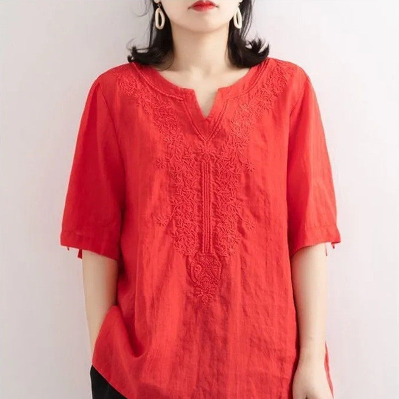 中国风棉麻薄款衬衫女V领短袖重工刺绣复古女士夏季简约文艺上衣