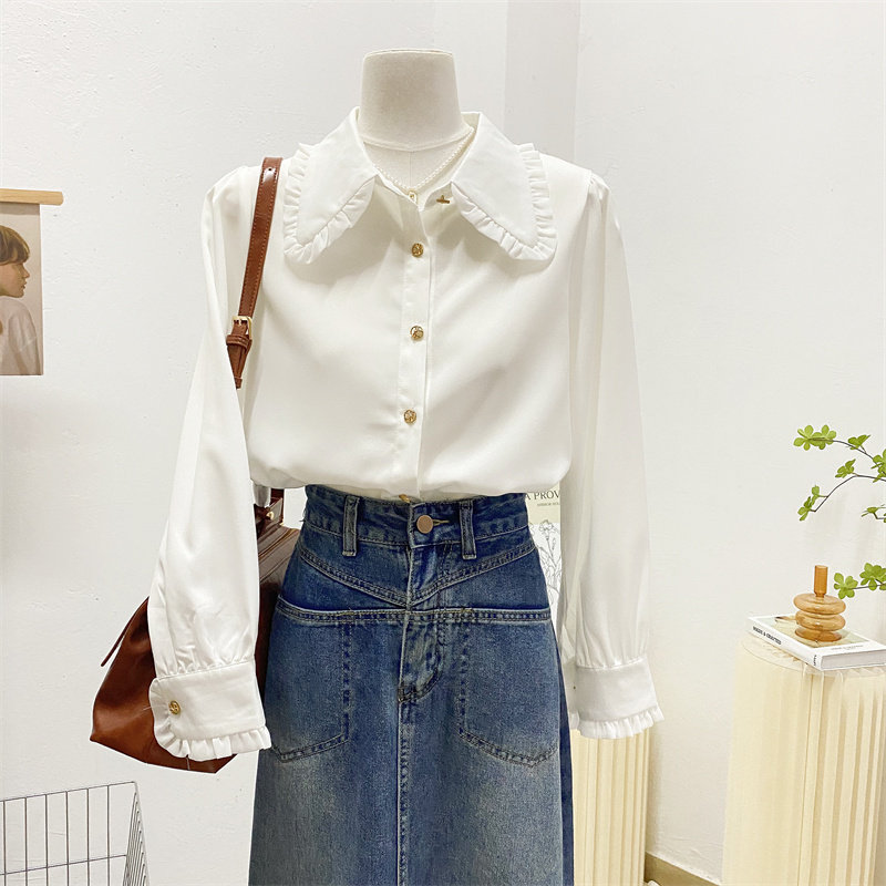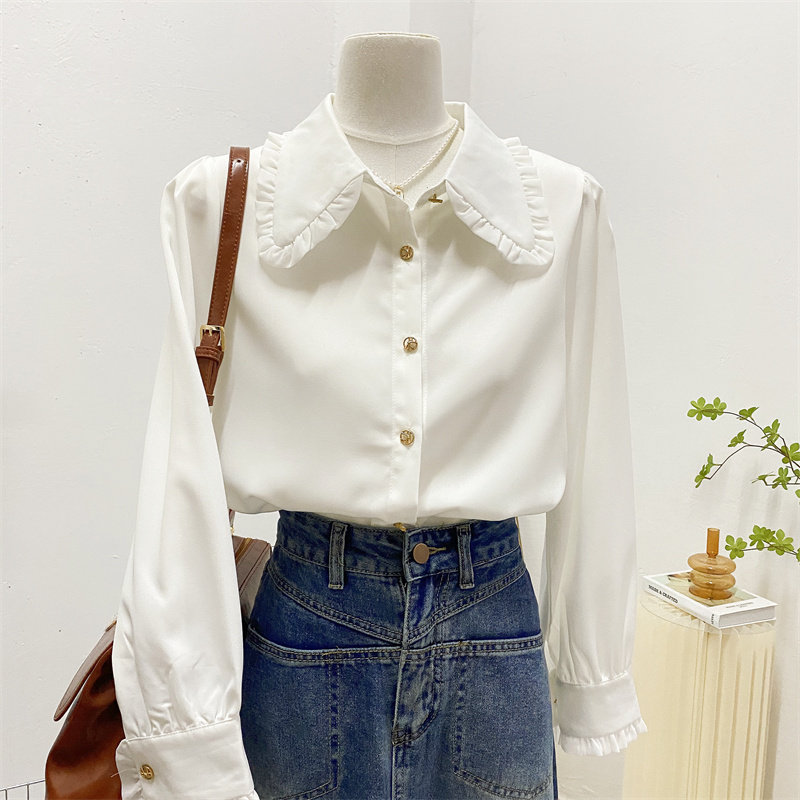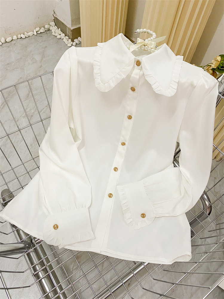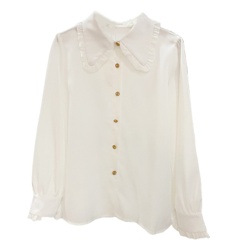 宽松甜美木耳边娃娃领长袖衬衫女