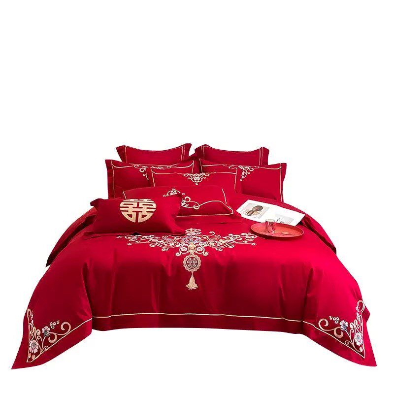 结婚大红色全棉纯棉四件套刺绣被套中式婚庆陪嫁床上用品陪嫁床单