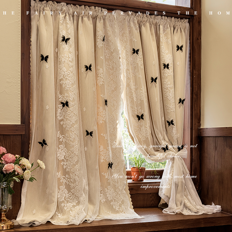 双层遮光卧室窗帘纱布一体公主风法式奶茶色ins蝴蝶网红蕾丝门帘