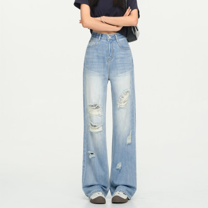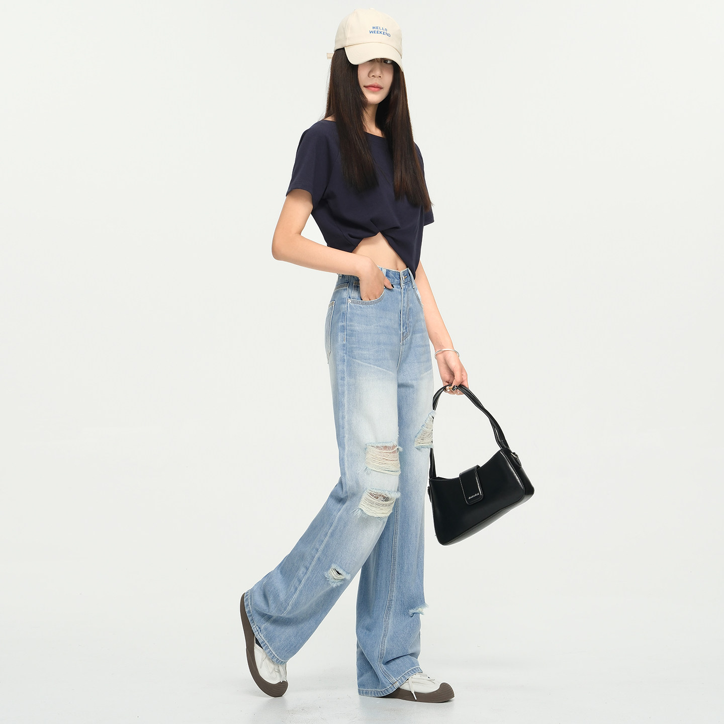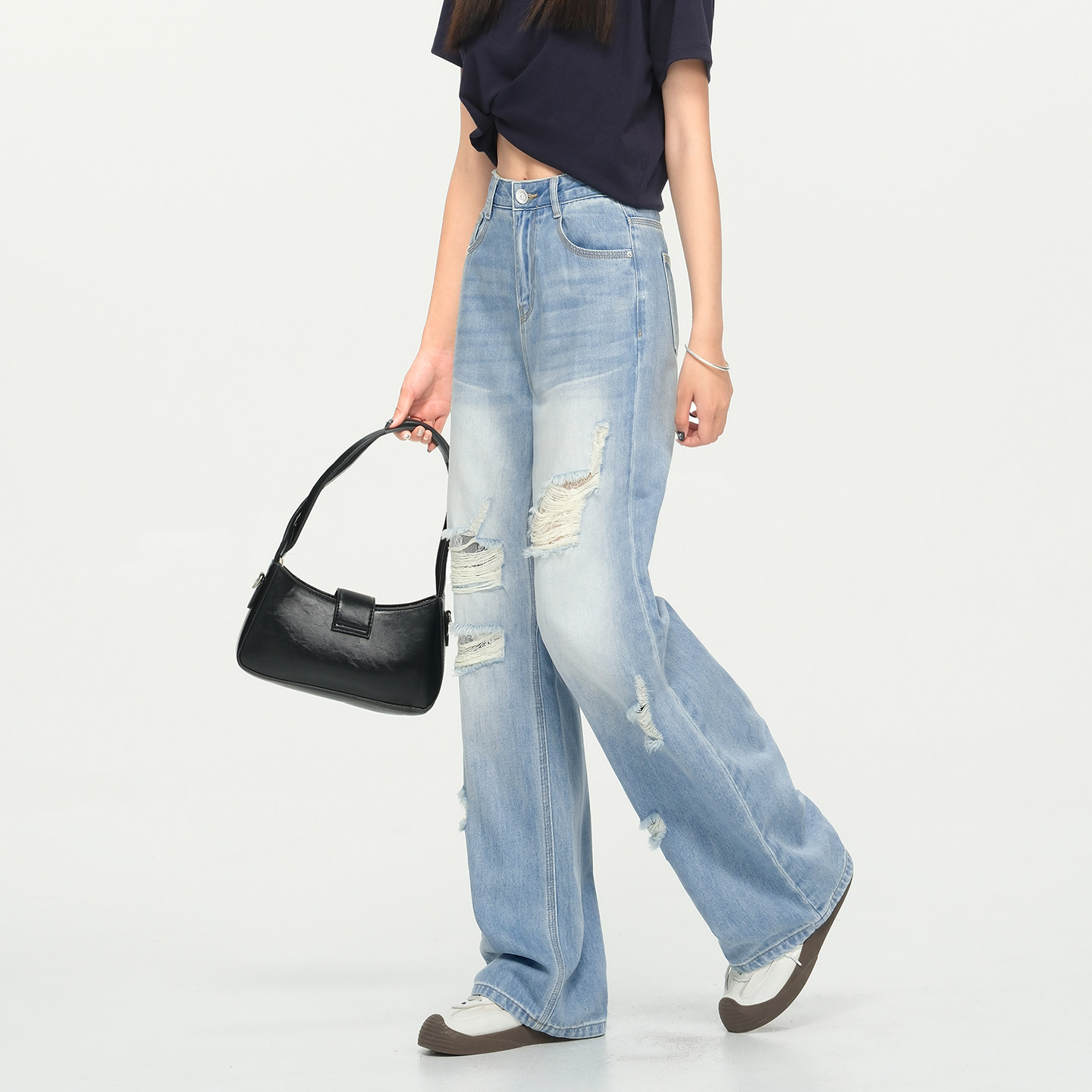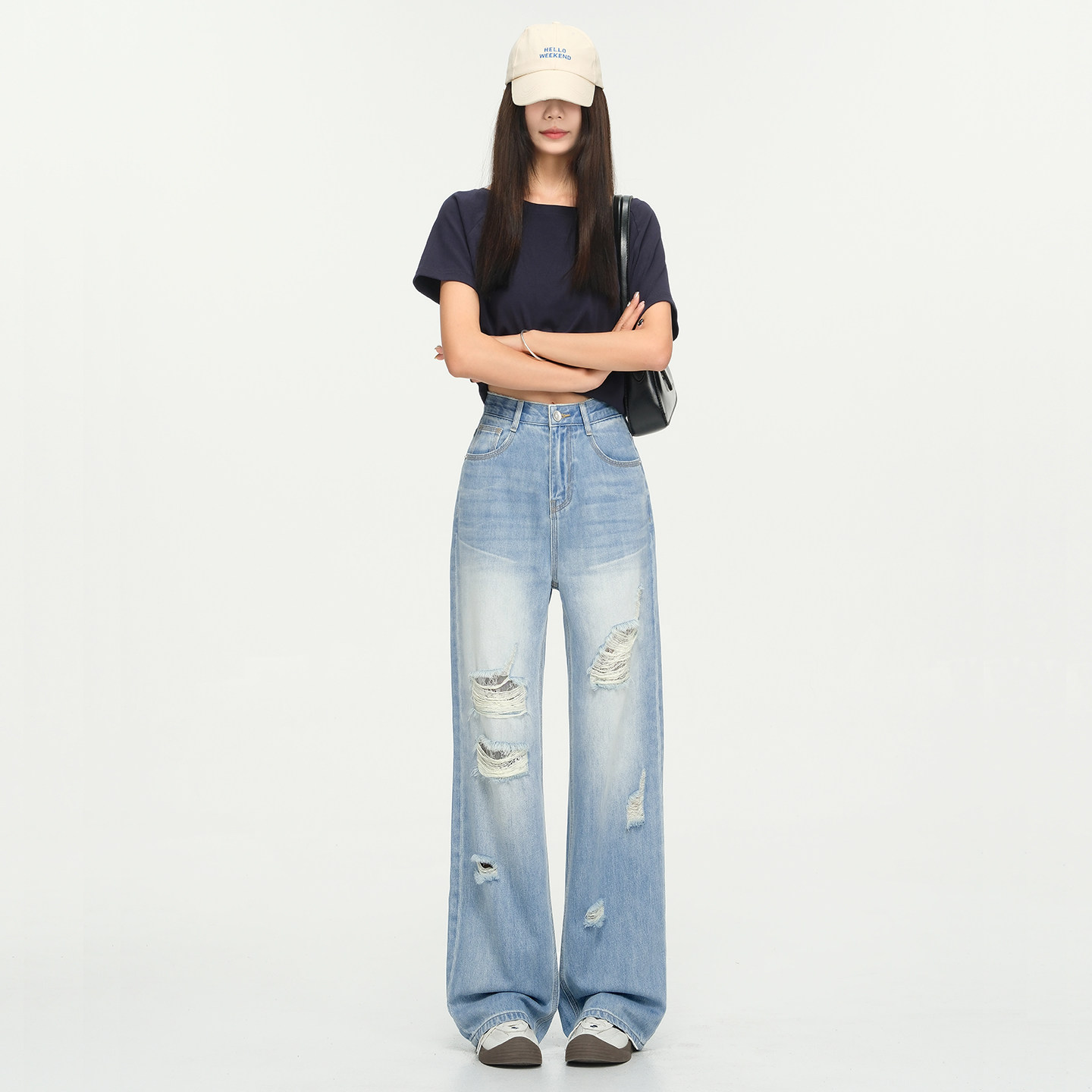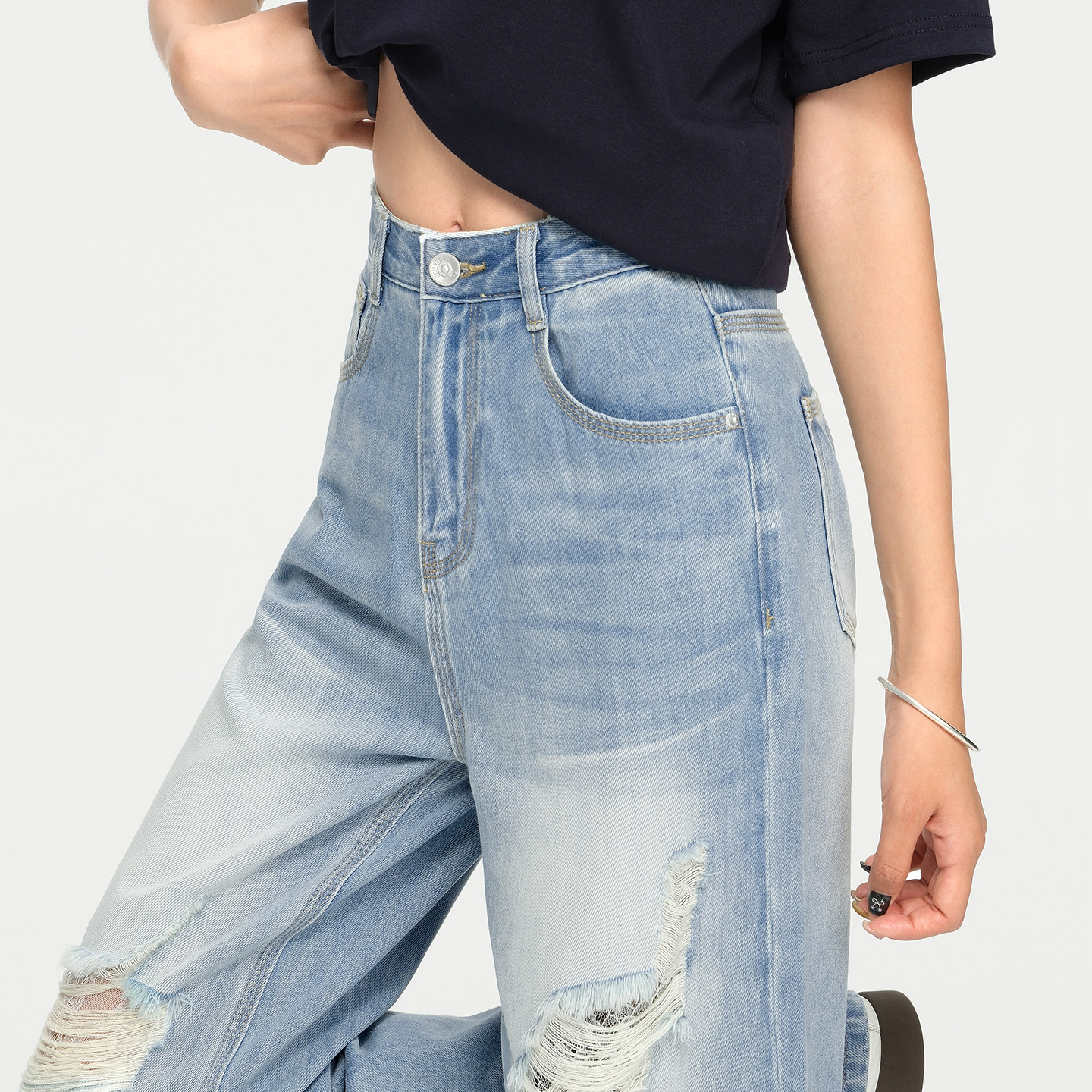磨破设计显瘦宽松拖地阔腿牛仔裤