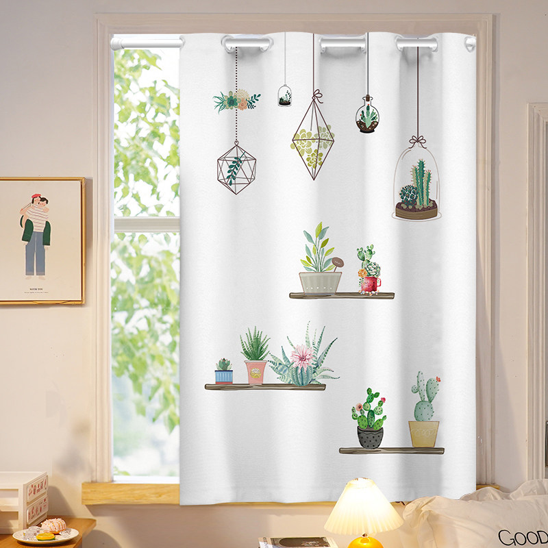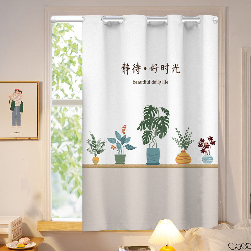 绿色植物卧室小窗帘免打孔安装租房专用全遮光短款简易飘窗布帘子